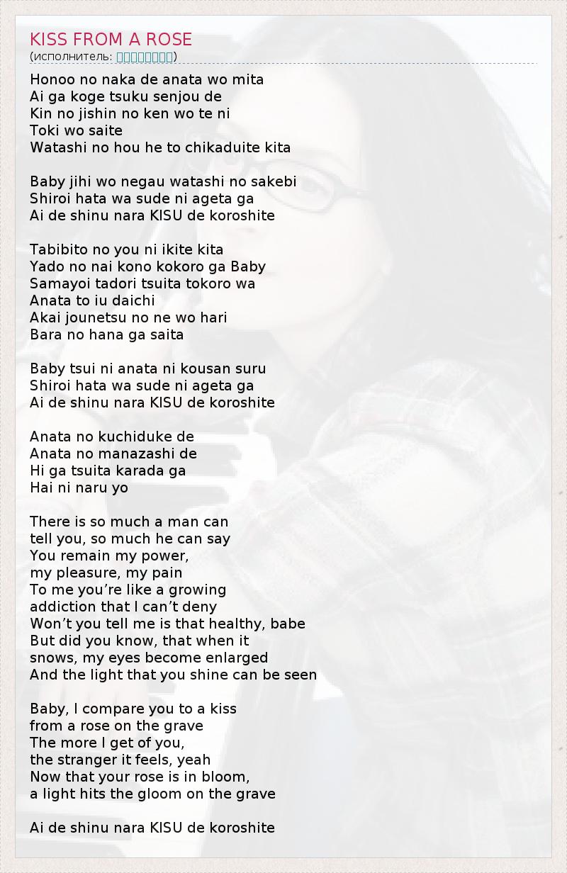 Honoo no naka de anata wo mita Ai ga koge tsuku senjou de Kin no jishin no ken wo te ni Toki wo saite Watashi no hou he to chikaduite kita Baby jihi wo negau watashi no sakebi Shiroi hata wa sude ni ageta ga Ai de shinu nara KISU de koroshite Tabibito no you ni ikite kita Yado no nai kono kokoro ga Baby Samayoi tadori tsuita tokoro wa Anata to iu daichi Akai jounetsu no ne wo hari Bara no hana ga saita Baby tsui ni anata ni kousan suru Shiroi hata wa sude ni ageta ga Ai de shinu nara KISU de koroshite Anata no kuchiduke de Anata no manazashi de Hi ga tsuita karada ga Hai ni naru yo There is so much a man can tell you, so much he can say You remain my power, my pleasure, my pain To me you’re like a growing addiction that I can’t deny Won’t you tell me is that healthy, babe But did you know, that when it snows, my eyes become enlarged And the light that you shine can be seen Baby, I compare you to a kiss from a rose on the grave The more I get of you, the stranger it feels, yeah Now that your rose is in bloom, a light hits the gloom on the grave Ai de shinu nara KISU de koroshite