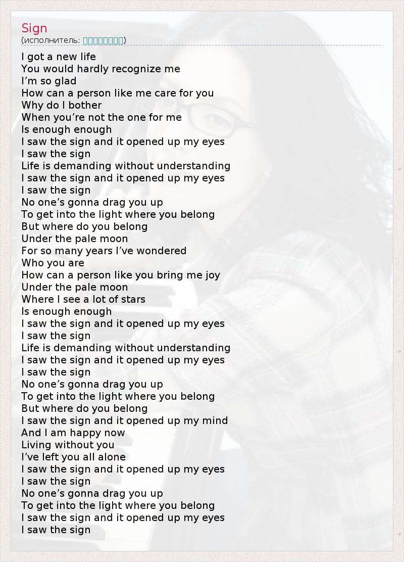 У меня новая жизнь, Ты едва узнаешь меня – Я рада. Как может человек вроде меня беспокоиться о тебе? Почему я волнуюсь? Когда ты – не тот для меня, Все, хватит, хватит! Я видела знак, и он открыл мои глаза. Я видела знак. Жизнь не требует понимания. Я видела знак, и он открыл мои глаза. Я видела знак. Никто не принуждает тебя - Тянуться к свету, которому ты принадлежишь, Но где именно ты находишься Под бледной луной? Вопрос, который волновал меня в течение многих лет – Кто ты? Как может человек вроде тебя радовать меня Под бледной луной, Где я видела множество звезд? Все, хватит, хватит! Я видела знак, и он открыл мои глаза. Я видела знак. Жизнь не требует понимания. Я видела знак, и он открыл мои глаза. Я видела знак. Никто не принуждает тебя Тянуться к свету, которому ты принадлежишь, Но где именно ты? Я видела знак, и он открыл мой разум. И сейчас я счастлива, Живя без тебя. Я бросила тебя. Я видела знак, и он открыл мои глаза. Я видела знак. Никто не принуждает тебя Тянуться к свету, которому ты принадлежишь. Я видела знак, и он открыл мои глаза. Я видела знак.