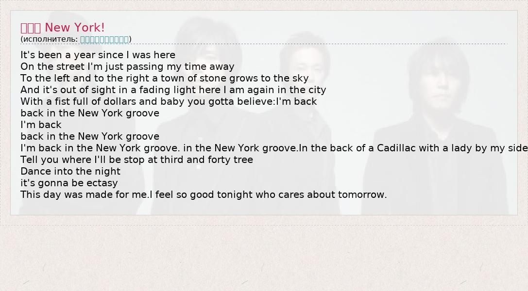 It's been a year since I was here On the street I'm just passing my time away To the left and to the right a town of stone grows to the sky And it's out of sight in a fading light here I am again in the city With a fist full of dollars and baby you gotta believe:I'm back back in the New York groove I'm back back in the New York groove I'm back in the New York groove. in the New York groove.In the back of a Cadillac with a lady by my side Tell you where I'll be stop at third and forty tree Dance into the night it's gonna be ectasy This day was made for me.I feel so good tonight who cares about tomorrow.