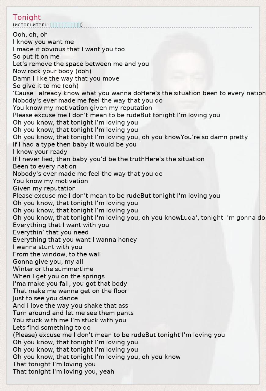 Ooh, oh, oh I know you want me I made it obvious that I want you too So put it on me Let's remove the space between me and you Now rock your body (ooh) Damn I like the way that you move So give it to me (ooh) 'Cause I already know what you wanna doHere's the situation been to every nation Nobody's ever made me feel the way that you do You know my motivation given my reputation Please excuse me I don't mean to be rudeBut tonight I'm loving you Oh you know, that tonight I'm loving you Oh you know, that tonight I'm loving you Oh you know, that tonight I'm loving you, oh you knowYou're so damn pretty If I had a type then baby it would be you I know your ready If I never lied, than baby you'd be the truthHere's the situation Been to every nation Nobody's ever made me feel the way that you do You know my motivation Given my reputation Please excuse me I don't mean to be rudeBut tonight I'm loving you Oh you know, that tonight I'm loving you Oh you know, that tonight I'm loving you Oh you know, that tonight I'm loving you, oh you knowLuda', tonight I'm gonna do Everything that I want with you Everythin' that you need Everything that you want I wanna honey I wanna stunt with you From the window, to the wall Gonna give you, my all Winter or the summertime When I get you on the springs I'ma make you fall, you got that body That make me wanna get on the floor Just to see you dance And I love the way you shake that ass Turn around and let me see them pants You stuck with me I'm stuck with you Lets find something to do (Please) excuse me I don't mean to be rudeBut tonight I'm loving you Oh you know, that tonight I'm loving you Oh you know, that tonight I'm loving you Oh you know, that tonight I'm loving you, oh you know That tonight I'm loving you That tonight I'm loving you, yeah