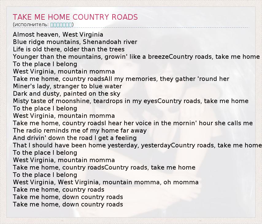 Almost heaven, West Virginia Blue ridge mountains, Shenandoah river Life is old there, older than the trees Younger than the mountains, growin' like a breezeCountry roads, take me home To the place I belong West Virginia, mountain momma Take me home, country roadsAll my memories, they gather 'round her Miner's lady, stranger to blue water Dark and dusty, painted on the sky Misty taste of moonshine, teardrops in my eyesCountry roads, take me home To the place I belong West Virginia, mountain momma Take me home, country roadsI hear her voice in the mornin' hour she calls me The radio reminds me of my home far away And drivin' down the road I get a feeling That I should have been home yesterday, yesterdayCountry roads, take me home To the place I belong West Virginia, mountain momma Take me home, country roadsCountry roads, take me home To the place I belong West Virginia, West Virginia, mountain momma, oh momma Take me home, country roads Take me home, down country roads Take me home, down country roads