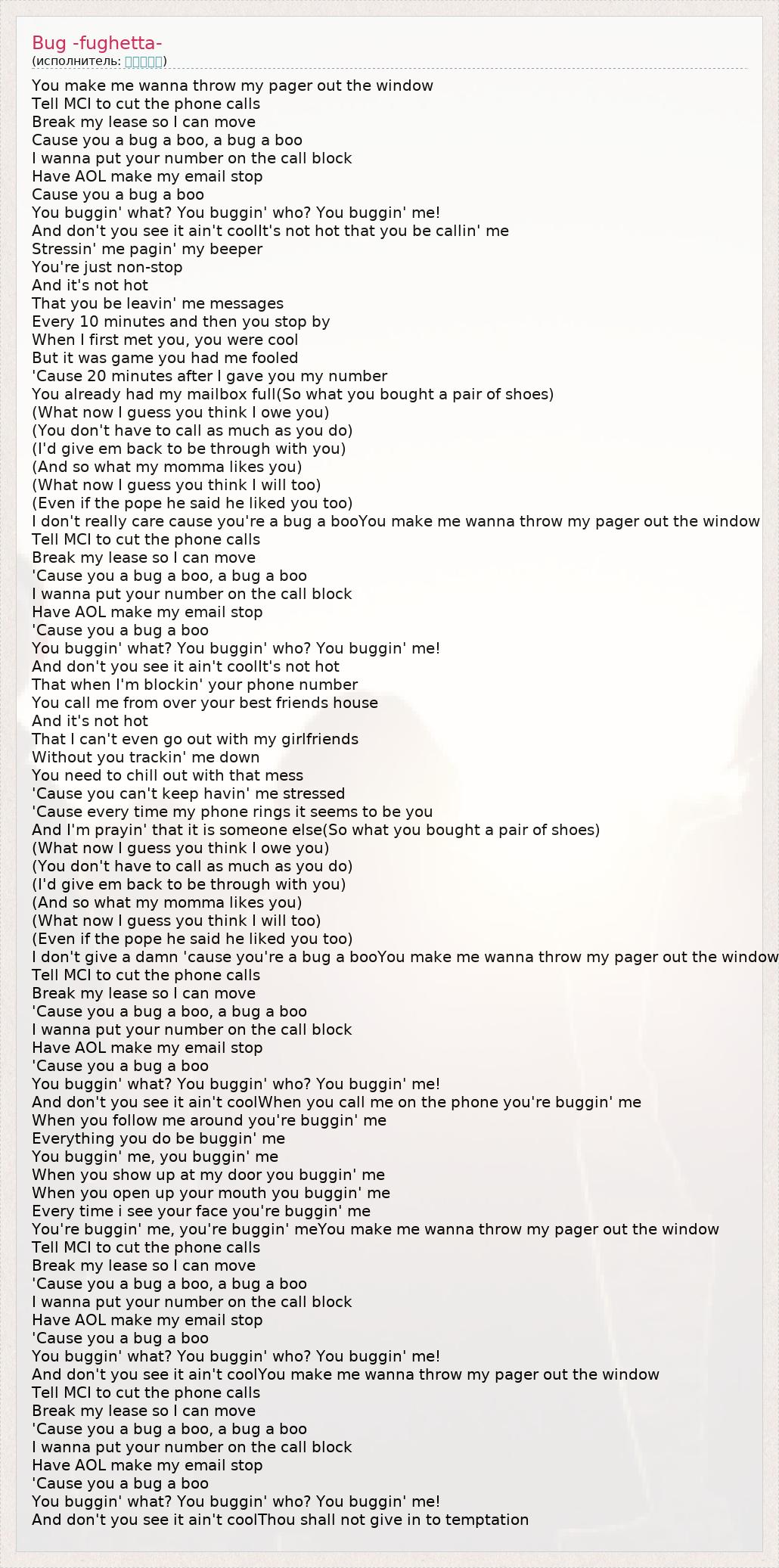 I don't really care cause you're a bug a booYou make me wanna throw my pager out the window