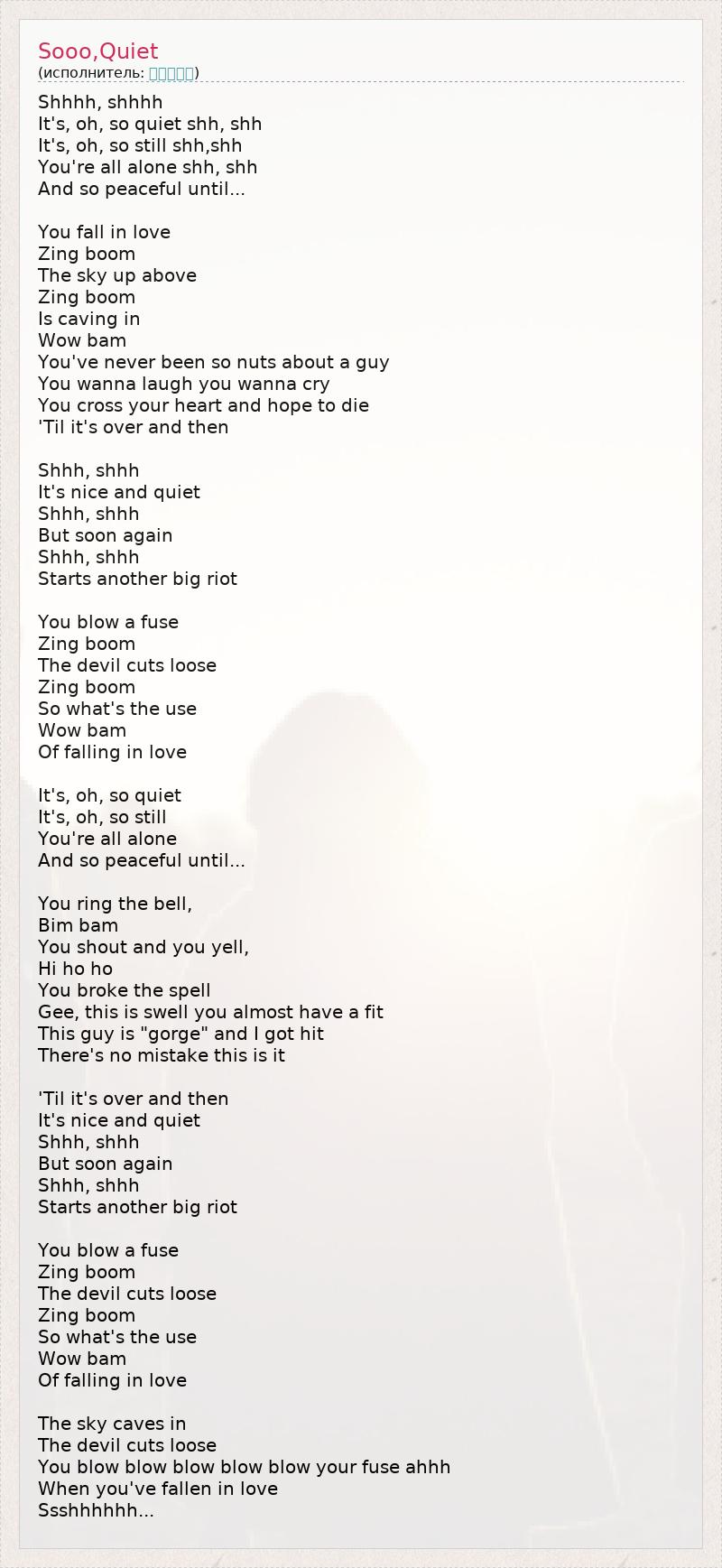 Shhhh, shhhh It's, oh, so quiet shh, shh It's, oh, so still shh,shh You're all alone shh, shh And so peaceful until... You fall in love Zing boom The sky up above Zing boom Is caving in Wow bam You've never been so nuts about a guy You wanna laugh you wanna cry You cross your heart and hope to die 'Til it's over and then Shhh, shhh It's nice and quiet Shhh, shhh But soon again Shhh, shhh Starts another big riot You blow a fuse Zing boom The devil cuts loose Zing boom So what's the use Wow bam Of falling in love It's, oh, so quiet It's, oh, so still You're all alone And so peaceful until... You ring the bell, Bim bam You shout and you yell, Hi ho ho You broke the spell Gee, this is swell you almost have a fit This guy is "gorge" and I got hit There's no mistake this is it 'Til it's over and then It's nice and quiet Shhh, shhh But soon again Shhh, shhh Starts another big riot You blow a fuse Zing boom The devil cuts loose Zing boom So what's the use Wow bam Of falling in love The sky caves in The devil cuts loose You blow blow blow blow blow your fuse ahhh When you've fallen in love Ssshhhhhh...