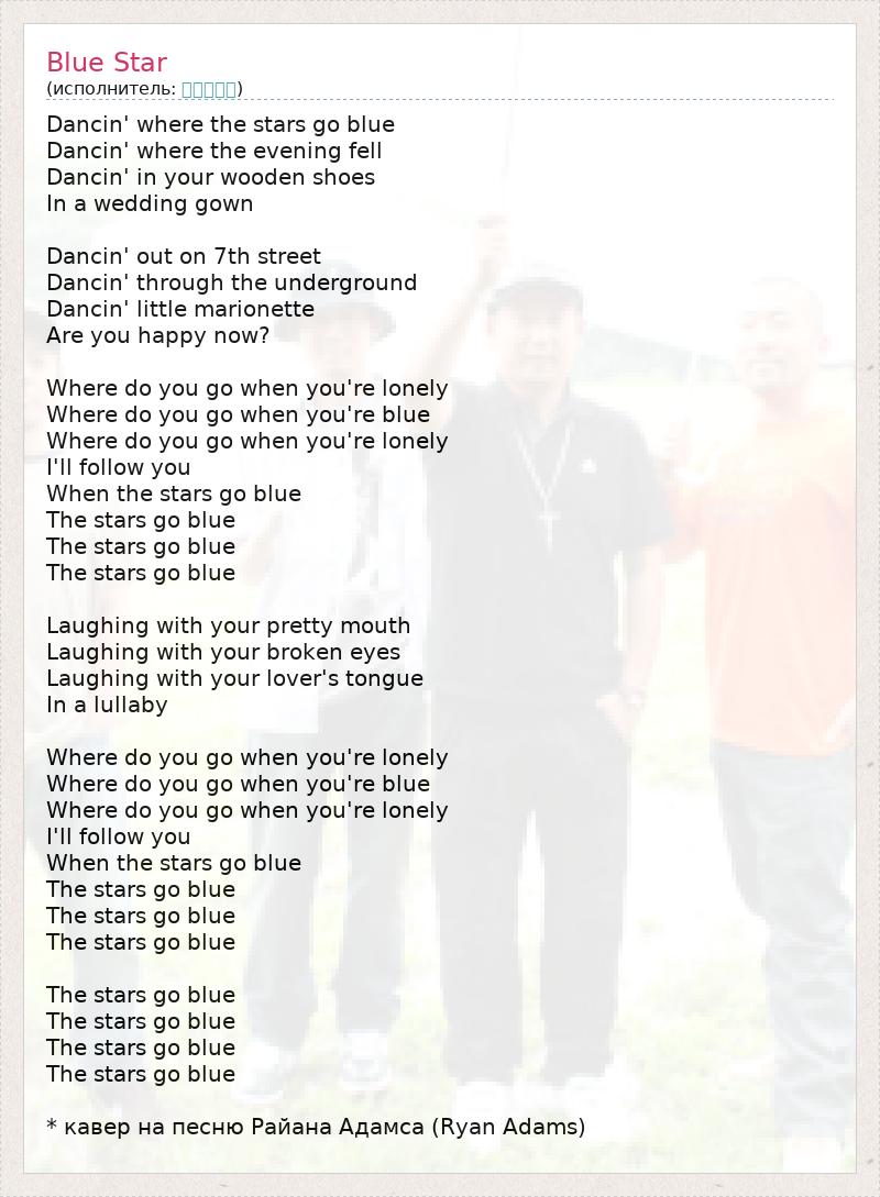 Dancin' where the stars go blue Dancin' where the evening fell Dancin' in your wooden shoes In a wedding gown Dancin' out on 7th street Dancin' through the underground Dancin' little marionette Are you happy now? Where do you go when you're lonely Where do you go when you're blue Where do you go when you're lonely I'll follow you When the stars go blue The stars go blue The stars go blue The stars go blue Laughing with your pretty mouth Laughing with your broken eyes Laughing with your lover's tongue In a lullaby Where do you go when you're lonely Where do you go when you're blue Where do you go when you're lonely I'll follow you When the stars go blue The stars go blue The stars go blue The stars go blue The stars go blue The stars go blue The stars go blue The stars go blue * кавер на песню Райана Адамса (Ryan Adams)