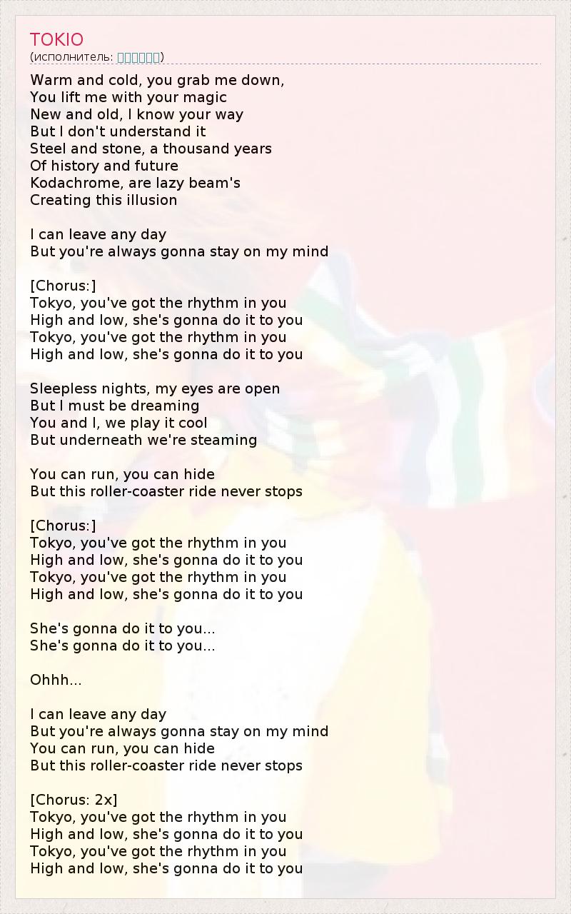 Warm and cold, you grab me down, You lift me with your magic New and old, I know your way But I don't understand it Steel and stone, a thousand years Of history and future Kodachrome, are lazy beam's Creating this illusion I can leave any day But you're always gonna stay on my mind [Chorus:] Tokyo, you've got the rhythm in you High and low, she's gonna do it to you Tokyo, you've got the rhythm in you High and low, she's gonna do it to you Sleepless nights, my eyes are open But I must be dreaming You and I, we play it cool But underneath we're steaming You can run, you can hide But this roller-coaster ride never stops [Chorus:] Tokyo, you've got the rhythm in you High and low, she's gonna do it to you Tokyo, you've got the rhythm in you High and low, she's gonna do it to you She's gonna do it to you... She's gonna do it to you... Ohhh... I can leave any day But you're always gonna stay on my mind You can run, you can hide But this roller-coaster ride never stops [Chorus: 2x] Tokyo, you've got the rhythm in you High and low, she's gonna do it to you Tokyo, you've got the rhythm in you High and low, she's gonna do it to you