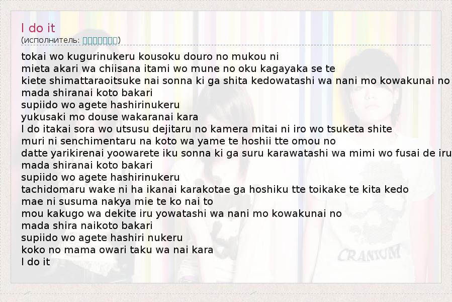 tokai wo kugurinukeru kousoku douro no mukou ni mieta akari wa chiisana itami wo mune no oku kagayaka se te kiete shimattaraoitsuke nai sonna ki ga shita kedowatashi wa nani mo kowakunai no mada shiranai koto bakari supiido wo agete hashirinukeru yukusaki mo douse wakaranai kara I do itakai sora wo utsusu dejitaru no kamera mitai ni iro wo tsuketa shite muri ni senchimentaru na koto wa yame te hoshii tte omou no datte yarikirenai yoowarete iku sonna ki ga suru karawatashi wa mimi wo fusai de iru mada shiranai koto bakari supiido wo agete hashirinukeru tachidomaru wake ni ha ikanai karakotae ga hoshiku tte toikake te kita kedo mae ni susuma nakya mie te ko nai to mou kakugo wa dekite iru yowatashi wa nani mo kowakunai no mada shira naikoto bakari supiido wo agete hashiri nukeru koko no mama owari taku wa nai kara I do it