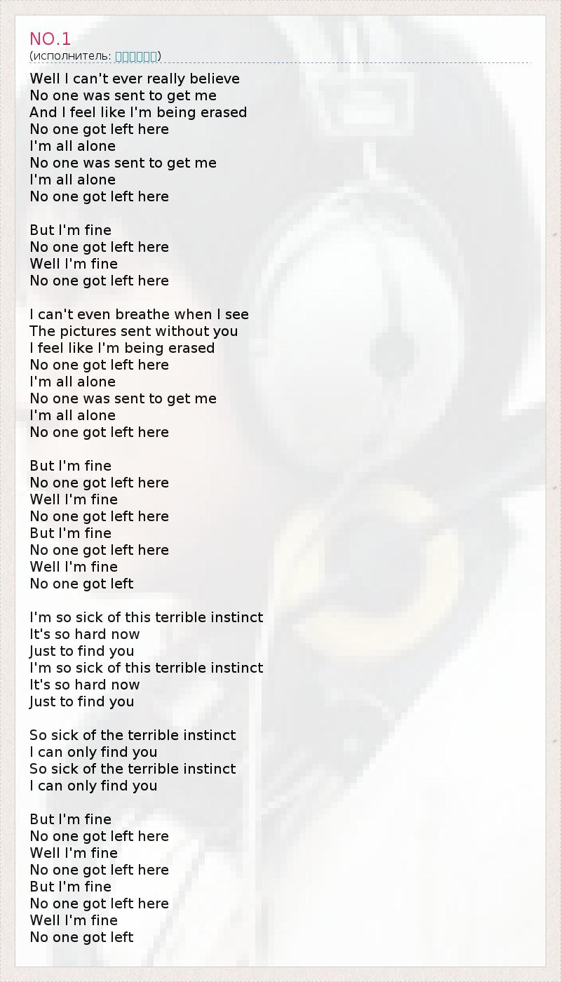 Я до сих пор не могу поверить, Что я никому не нужен. 1 Такое чувство, будто меня стирают из бытия. Здесь больше никого не осталось. Я совсем один. Я никому не нужен. Я совсем один. Здесь больше никого не осталось. Но я в порядке. Здесь больше никого не осталось. Что ж, я в порядке. Здесь больше никого не осталось. Мне трудно дышать, если я вижу Фотографии, отправленные не тобой. Такое чувство, будто меня стирают из бытия. Здесь больше никого не осталось. Я совсем один. Я никому не нужен. Я совсем один. Здесь больше никого не осталось. Но я в порядке. Здесь больше никого не осталось. Что ж, я в порядке. Здесь больше никого не осталось. Но я в порядке. Здесь больше никого не осталось. Что ж, я в порядке. Больше никого не осталось. Я устал от этого ужасного инстинкта. Мне трудно Просто найти тебя. Я устал от этого ужасного инстинкта. Мне трудно Просто найти тебя. Так устал от ужасного инстинкта. Я могу только найти тебя. Так устал от ужасного инстинкта. Я могу только найти тебя. Но я в порядке. Здесь больше никого не осталось. Что ж, я в порядке. Здесь больше никого не осталось. Но я в порядке. Здесь больше никого не осталось. Что ж, я в порядке. Больше никого не осталось. 1 - дословно: за мной никого не послали