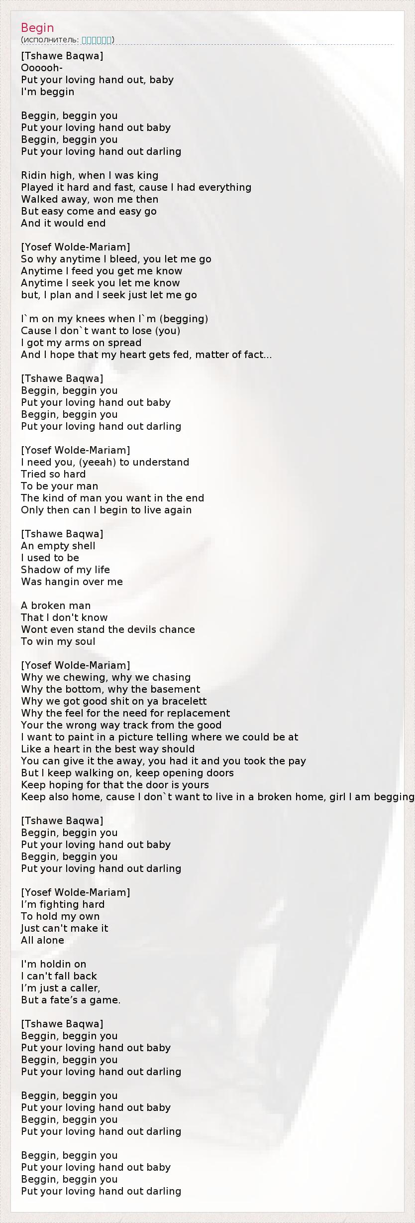 [Tshawe Baqwa] Oooooh- Put your loving hand out, baby I'm beggin Beggin, beggin you Put your loving hand out baby Beggin, beggin you Put your loving hand out darling Ridin high, when I was king Played it hard and fast, cause I had everything Walked away, won me then But easy come and easy go And it would end [Yosef Wolde-Mariam] So why anytime I bleed, you let me go Anytime I feed you get me know Anytime I seek you let me know but, I plan and I seek just let me go I`m on my knees when I`m (begging) Cause I don`t want to lose (you) I got my arms on spread And I hope that my heart gets fed, matter of fact... [Tshawe Baqwa] Beggin, beggin you Put your loving hand out baby Beggin, beggin you Put your loving hand out darling [Yosef Wolde-Mariam] I need you, (yeeah) to understand Tried so hard To be your man The kind of man you want in the end Only then can I begin to live again [Tshawe Baqwa] An empty shell I used to be Shadow of my life Was hangin over me A broken man That I don't know Wont even stand the devils chance To win my soul [Yosef Wolde-Mariam] Why we chewing, why we chasing Why the bottom, why the basement Why we got good shit on ya bracelett Why the feel for the need for replacement Your the wrong way track from the good I want to paint in a picture telling where we could be at Like a heart in the best way should You can give it the away, you had it and you took the pay But I keep walking on, keep opening doors Keep hoping for that the door is yours Keep also home, cause I don`t want to live in a broken home, girl I am begging [Tshawe Baqwa] Beggin, beggin you Put your loving hand out baby Beggin, beggin you Put your loving hand out darling [Yosef Wolde-Mariam] I’m fighting hard To hold my own Just can't make it All alone I'm holdin on I can't fall back I’m just a caller, But a fate’s a game. [Tshawe Baqwa] Beggin, beggin you Put your loving hand out baby Beggin, beggin you Put your loving hand out darling Beggin, beggin you Put your loving hand out baby Beggin, beggin you Put your loving hand out darling Beggin, beggin you Put your loving hand out baby Beggin, beggin you Put your loving hand out darling