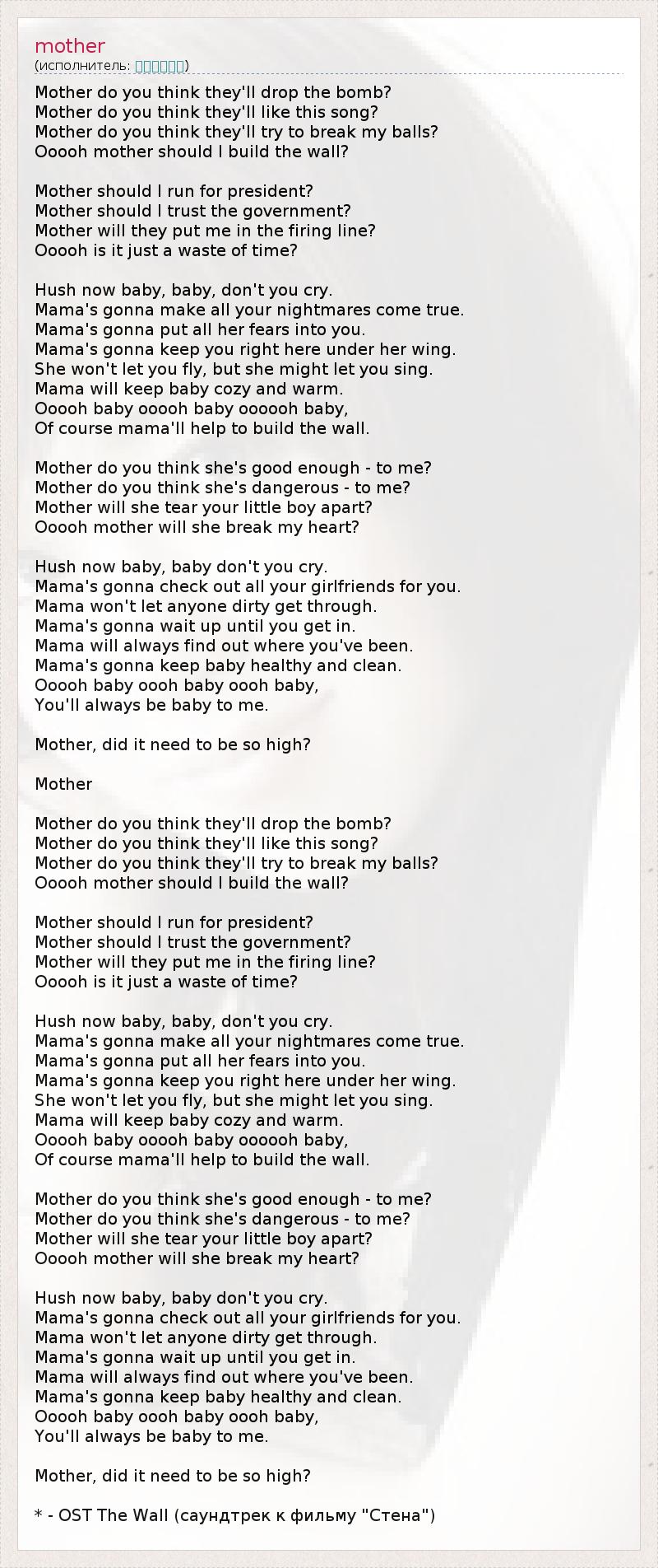 Mother do you think they'll drop the bomb? Mother do you think they'll like this song? Mother do you think they'll try to break my balls? Ooooh mother should I build the wall? Mother should I run for president? Mother should I trust the government? Mother will they put me in the firing line? Ooooh is it just a waste of time? Hush now baby, baby, don't you cry. Mama's gonna make all your nightmares come true. Mama's gonna put all her fears into you. Mama's gonna keep you right here under her wing. She won't let you fly, but she might let you sing. Mama will keep baby cozy and warm. Ooooh baby ooooh baby oooooh baby, Of course mama'll help to build the wall. Mother do you think she's good enough - to me? Mother do you think she's dangerous - to me? Mother will she tear your little boy apart? Ooooh mother will she break my heart? Hush now baby, baby don't you cry. Mama's gonna check out all your girlfriends for you. Mama won't let anyone dirty get through. Mama's gonna wait up until you get in. Mama will always find out where you've been. Mama's gonna keep baby healthy and clean. Ooooh baby oooh baby oooh baby, You'll always be baby to me. Mother, did it need to be so high? Mother Mother do you think they'll drop the bomb? Mother do you think they'll like this song? Mother do you think they'll try to break my balls? Ooooh mother should I build the wall? Mother should I run for president? Mother should I trust the government? Mother will they put me in the firing line? Ooooh is it just a waste of time? Hush now baby, baby, don't you cry. Mama's gonna make all your nightmares come true. Mama's gonna put all her fears into you. Mama's gonna keep you right here under her wing. She won't let you fly, but she might let you sing. Mama will keep baby cozy and warm. Ooooh baby ooooh baby oooooh baby, Of course mama'll help to build the wall. Mother do you think she's good enough - to me? Mother do you think she's dangerous - to me? Mother will she tear your little boy apart? Ooooh mother will she break my heart? Hush now baby, baby don't you cry. Mama's gonna check out all your girlfriends for you. Mama won't let anyone dirty get through. Mama's gonna wait up until you get in. Mama will always find out where you've been. Mama's gonna keep baby healthy and clean. Ooooh baby oooh baby oooh baby, You'll always be baby to me. Mother, did it need to be so high? * - OST The Wall (саундтрек к фильму "Стена")