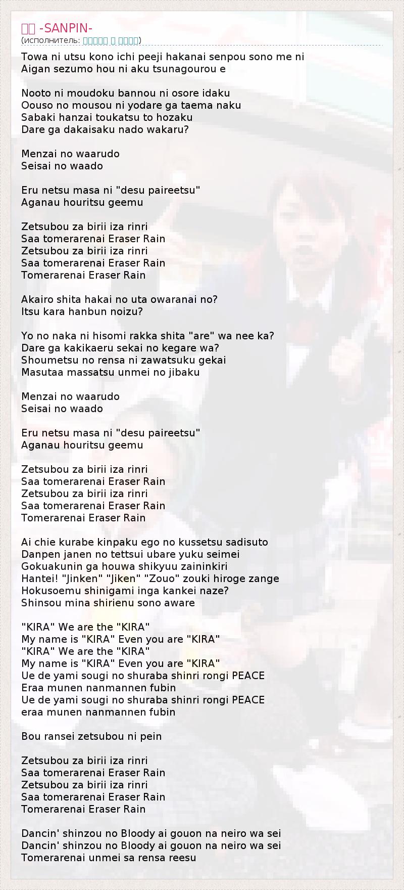 Towa ni utsu kono ichi peeji hakanai senpou sono me ni Aigan sezumo hou ni aku tsunagourou e Nooto ni moudoku bannou ni osore idaku Oouso no mousou ni yodare ga taema naku Sabaki hanzai toukatsu to hozaku Dare ga dakaisaku nado wakaru? Menzai no waarudo Seisai no waado Eru netsu masa ni "desu paireetsu" Aganau houritsu geemu Zetsubou za birii iza rinri Saa tomerarenai Eraser Rain Zetsubou za birii iza rinri Saa tomerarenai Eraser Rain Tomerarenai Eraser Rain Akairo shita hakai no uta owaranai no? Itsu kara hanbun noizu? Yo no naka ni hisomi rakka shita "are" wa nee ka? Dare ga kakikaeru sekai no kegare wa? Shoumetsu no rensa ni zawatsuku gekai Masutaa massatsu unmei no jibaku Menzai no waarudo Seisai no waado Eru netsu masa ni "desu paireetsu" Aganau houritsu geemu Zetsubou za birii iza rinri Saa tomerarenai Eraser Rain Zetsubou za birii iza rinri Saa tomerarenai Eraser Rain Tomerarenai Eraser Rain Ai chie kurabe kinpaku ego no kussetsu sadisuto Danpen janen no tettsui ubare yuku seimei Gokuakunin ga houwa shikyuu zaininkiri Hantei! "Jinken" "Jiken" "Zouo" zouki hiroge zange Hokusoemu shinigami inga kankei naze? Shinsou mina shirienu sono aware "KIRA" We are the "KIRA" My name is "KIRA" Even you are "KIRA" "KIRA" We are the "KIRA" My name is "KIRA" Even you are "KIRA" Ue de yami sougi no shuraba shinri rongi PEACE Eraa munen nanmannen fubin Ue de yami sougi no shuraba shinri rongi PEACE eraa munen nanmannen fubin Bou ransei zetsubou ni pein Zetsubou za birii iza rinri Saa tomerarenai Eraser Rain Zetsubou za birii iza rinri Saa tomerarenai Eraser Rain Tomerarenai Eraser Rain Dancin' shinzou no Bloody ai gouon na neiro wa sei Dancin' shinzou no Bloody ai gouon na neiro wa sei Tomerarenai unmei sa rensa reesu