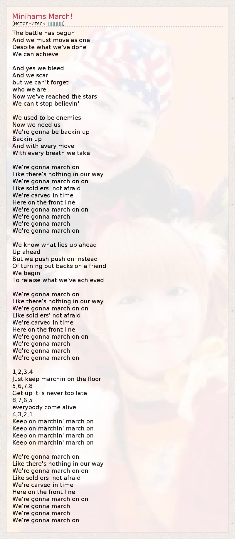 The battle has begun And we must move as one Despite what we've done We can achieve And yes we bleed And we scar but we can't forget who we are Now we've reached the stars We can't stop believin' We used to be enemies Now we need us We're gonna be backin up Backin up And with every move With every breath we take We're gonna march on Like there's nothing in our way We're gonna march on on Like soldiers not afraid We're carved in time Here on the front line We're gonna march on on We're gonna march We're gonna march We're gonna march on We know what lies up ahead Up ahead But we push push on instead Of turning out backs on a friend We begin To relaise what we've achieved We're gonna march on Like there's nothing in our way We're gonna march on on Like soldiers' not afraid We're carved in time Here on the front line We're gonna march on on We're gonna march We're gonna march We're gonna march on 1,2,3,4 Just keep marchin on the floor 5,6,7,8 Get up itТs never too late 8,7,6,5 everybody come alive 4,3,2,1 Keep on marchin' march on Keep on marchin' march on Keep on marchin' march on Keep on marchin' march on We're gonna march on Like there's nothing in our way We're gonna march on on Like soldiers not afraid We're carved in time Here on the front line We're gonna march on on We're gonna march We're gonna march We're gonna march on
