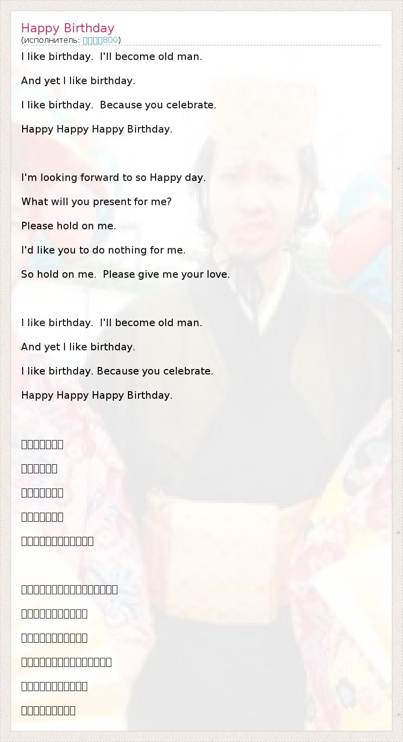 I like birthday. I'll become old man. And yet I like birthday. I like birthday. Because you celebrate. Happy Happy Happy Birthday. I'm looking forward to so Happy day. What will you present for me? Please hold on me. I'd like you to do nothing for me. So hold on me. Please give me your love. I like birthday. I'll become old man. And yet I like birthday. I like birthday. Because you celebrate. Happy Happy Happy Birthday. 誕生日が大好き 年をとるけど それでも大好き 誕生日が大好き あなたが祝ってくれるから 僕は最高に幸せな日が待ちどおしい あなたは何をくれるかな 抱きしめてちょーだい! 僕のために何もしなくていいから だから抱きしめて下さい あなたの愛を下さい
