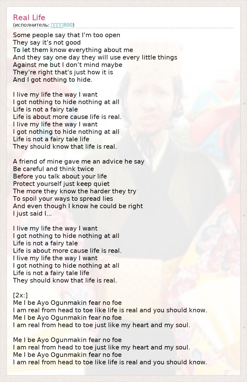 Некоторые говорят, что я слишком открыта, Говорят, что это нехорошо - Всё о себе рассказывать. Говорят, что однажды против меня используют Каждую мелочь, но я не возражаю. Возможно, Они и правы, так и есть, И мне нечего скрывать. Я живу, как хочу, Мне нечего скрывать, Жизнь - не сказка, Жизнь - что-то большее, потому что жизнь реальна. Я живу, как хочу, Мне нечего скрывать, Жизнь - не сказка, Жизнь - что-то большее, потому что жизнь реальна. Мой друг посоветовал мне Быть осторожной и думать дважды, Прежде чем говорить о своей жизни, Защищать себя, хранить молчание. Чем больше знают другие, тем больше стараются Испортить тебе жизнь, распространить слухи. И даже несмотря на то, что он может быть прав, Я сказала, что я... Я живу, как хочу, Мне нечего скрывать, Жизнь - не сказка, Жизнь - что-то большее, потому что жизнь реальна. Я живу, как хочу, Мне нечего скрывать, Жизнь - не сказка, Жизнь - что-то большее, потому что жизнь реальна. [2x:] Я, я - Ayo Ogunmakin, я не испытываю страха, у меня нет врагов, Я настоящая - от макушки до пят, жизнь реально - вы должны об этом знать... Я, я - Ayo Ogunmakin, я не испытываю страха, у меня нет врагов, Я настоящая - от макушки до пят, как и мои сердце и душа. Я, я - Ayo Ogunmakin, я не испытываю страха, у меня нет врагов, Я настоящая - от макушки до пят, как и мои сердце и душа. Я, я - Ayo Ogunmakin, я не испытываю страха, у меня нет врагов, Я настоящая - от макушки до пят, жизнь реально - вы должны об этом знать...
