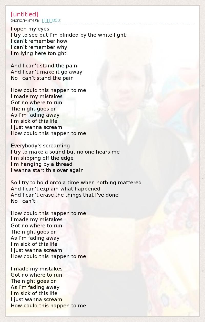 Я открываю глаза Пытаюсь смотреть, но я ослеплён Белым светом. Я не помню как, Я не помню почему Я оказался здесь сегодня вечером. И я не могу выдержать боль И я не могу сделать так, чтоб всё прошло Нет, я не могу выдержать боль Как это могло со мной произойти? Я совершил ошибки Мне некуда бежать Ночь продолжается… И я исчезаю… Я устал от этой жизни Я просто хочу кричать Как это могло со мной произойти? Все кричат Я пытаюсь произнести звук Но никто меня не слышит Я на самом краю Я держусь на нити Я хочу начать всё заново Поэтому я пытаюсь стереть Время, когда ничто не имело значения И я не могу объяснить, что произошло И я не могу стереть всё, что я сделал Нет, я не могу Как это могло со мной произойти? Я совершил ошибки Мне некуда бежать Ночь продолжается… И я исчезаю… Я устал от этой жизни Я просто хочу кричать Как это могло со мной произойти? Я совершил ошибки Мне некуда бежать Ночь продолжается… И я исчезаю… Я устал от этой жизни Я просто хочу кричать Как это могло со мной произойти?