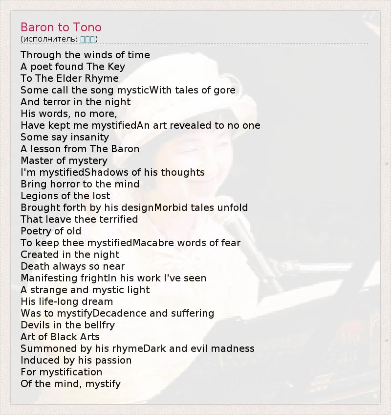 Through the winds of time A poet found The Key To The Elder Rhyme Some call the song mysticWith tales of gore And terror in the night His words, no more, Have kept me mystifiedAn art revealed to no one Some say insanity A lesson from The Baron Master of mystery I'm mystifiedShadows of his thoughts Bring horror to the mind Legions of the lost Brought forth by his designMorbid tales unfold That leave thee terrified Poetry of old To keep thee mystifiedMacabre words of fear Created in the night Death always so near Manifesting frightIn his work I've seen A strange and mystic light His life-long dream Was to mystifyDecadence and suffering Devils in the bellfry Art of Black Arts Summoned by his rhymeDark and evil madness Induced by his passion For mystification Of the mind, mystify