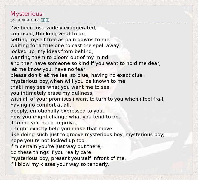 i've been lost, widely exaggerated, confused, thinking what to do. setting myself free as pain dawns to me, waiting for a true one to cast the spell away. locked up, my ideas from behind, wanting them to bloom out of my mind and then have someone so kind.if you want to hold me dear, let me know you, have no fear. please don't let me feel so blue, having no exact clue. mysterious boy,when will you be known to me that i may see what you want me to see. you intimately erase my dullness, with all of your promises.i want to turn to you when i feel frail, having no comfort at all. deeply, emotionally expressed to you, how you might change what you tend to do. if to me you need to prove, i might exactly help you make that move like doing such just to groove.mysterious boy, mysterious boy, hope you're not locked up too. i'm certain you're just way out there, do these things if you really care. mysterious boy, present yourself infront of me, i'll blow my kisses your way so tenderly.