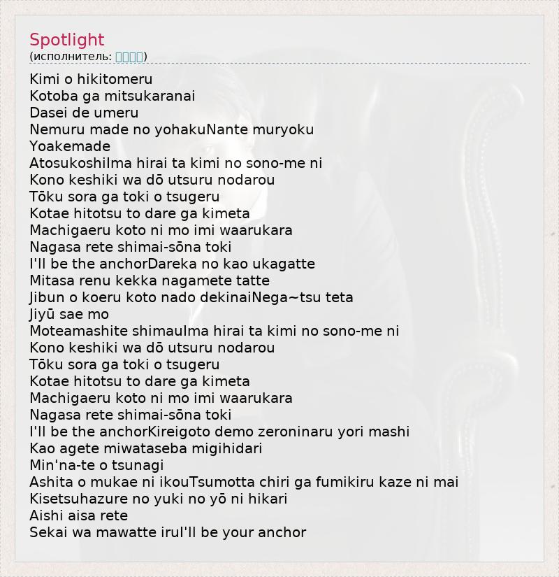 Kimi o hikitomeru Kotoba ga mitsukaranai Dasei de umeru Nemuru made no yohakuNante muryoku Yoakemade AtosukoshiIma hirai ta kimi no sono-me ni Kono keshiki wa dō utsuru nodarou Tōku sora ga toki o tsugeru Kotae hitotsu to dare ga kimeta Machigaeru koto ni mo imi waarukara Nagasa rete shimai-sōna toki I'll be the anchorDareka no kao ukagatte Mitasa renu kekka nagamete tatte Jibun o koeru koto nado dekinaiNega~tsu teta Jiyū sae mo Moteamashite shimauIma hirai ta kimi no sono-me ni Kono keshiki wa dō utsuru nodarou Tōku sora ga toki o tsugeru Kotae hitotsu to dare ga kimeta Machigaeru koto ni mo imi waarukara Nagasa rete shimai-sōna toki I'll be the anchorKireigoto demo zeroninaru yori mashi Kao agete miwataseba migihidari Min'na-te o tsunagi Ashita o mukae ni ikouTsumotta chiri ga fumikiru kaze ni mai Kisetsuhazure no yuki no yō ni hikari Aishi aisa rete Sekai wa mawatte iruI'll be your anchor