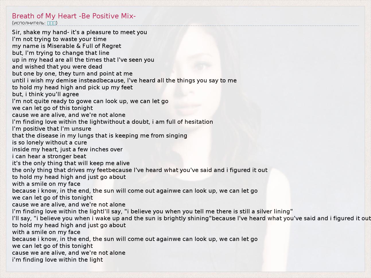 А как ты думаешь, о чем песня "Breath of My Heart -Be Positive Mix-" ?