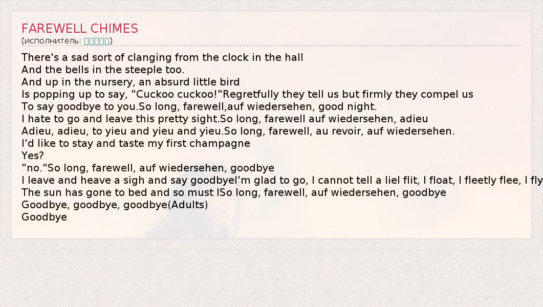 There's a sad sort of clanging from the clock in the hall And the bells in the steeple too. And up in the nursery, an absurd little bird Is popping up to say, "Cuckoo cuckoo!"Regretfully they tell us but firmly they compel us To say goodbye to you.So long, farewell,auf wiedersehen, good night. I hate to go and leave this pretty sight.So long, farewell auf wiedersehen, adieu Adieu, adieu, to yieu and yieu and yieu.So long, farewell, au revoir, auf wiedersehen. I'd like to stay and taste my first champagne Yes? "no."So long, farewell, auf wiedersehen, goodbye I leave and heave a sigh and say goodbyeI'm glad to go, I cannot tell a lieI flit, I float, I fleetly flee, I fly The sun has gone to bed and so must ISo long, farewell, auf wiedersehen, goodbye Goodbye, goodbye, goodbye(Adults) Goodbye