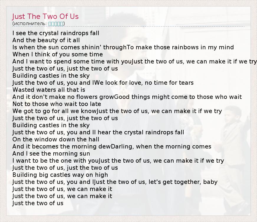 I see the crystal raindrops fall And the beauty of it all Is when the sun comes shinin' throughTo make those rainbows in my mind When I think of you some time And I want to spend some time with youJust the two of us, we can make it if we try Just the two of us, just the two of us Building castles in the sky Just the two of us, you and IWe look for love, no time for tears Wasted waters all that is And it don't make no flowers growGood things might come to those who wait Not to those who wait too late We got to go for all we knowJust the two of us, we can make it if we try Just the two of us, just the two of us Building castles in the sky Just the two of us, you and II hear the crystal raindrops fall On the window down the hall And it becomes the morning dewDarling, when the morning comes And I see the morning sun I want to be the one with youJust the two of us, we can make it if we try Just the two of us, just the two of us Building big castles way on high Just the two of us, you and IJust the two of us, let's get together, baby Just the two of us, we can make it Just the two of us, we can make it Just the two of us