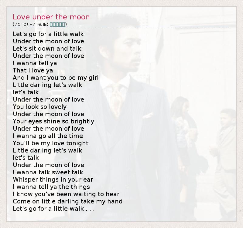Let's go for a little walk Under the moon of love Let's sit down and talk Under the moon of love I wanna tell ya That I love ya And I want you to be my girl Little darling let's walk let's talk Under the moon of love You look so lovely Under the moon of love Your eyes shine so brightly Under the moon of love I wanna go all the time You'll be my love tonight Little darling let's walk let's talk Under the moon of love I wanna talk sweet talk Whisper things in your ear I wanna tell ya the things I know you've been waiting to hear Come on little darling take my hand Let's go for a little walk . . .