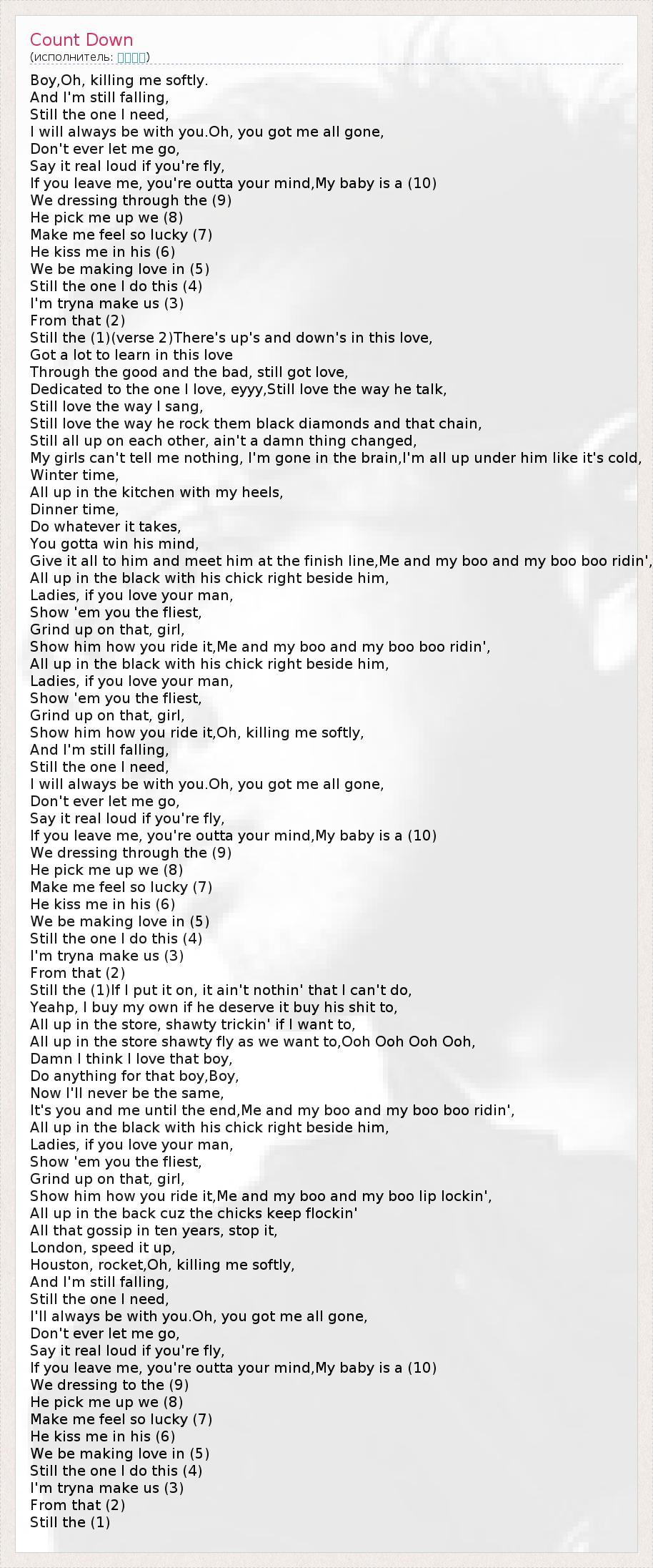 Boy,Oh, killing me softly. And I'm still falling, Still the one I need, I will always be with you.Oh, you got me all gone, Don't ever let me go, Say it real loud if you're fly, If you leave me, you're outta your mind,My baby is a (10) We dressing through the (9) He pick me up we (8) Make me feel so lucky (7) He kiss me in his (6) We be making love in (5) Still the one I do this (4) I'm tryna make us (3) From that (2) Still the (1)(verse 2)There's up's and down's in this love, Got a lot to learn in this love Through the good and the bad, still got love, Dedicated to the one I love, eyyy,Still love the way he talk, Still love the way I sang, Still love the way he rock them black diamonds and that chain, Still all up on each other, ain't a damn thing changed, My girls can't tell me nothing, I'm gone in the brain,I'm all up under him like it's cold, Winter time, All up in the kitchen with my heels, Dinner time, Do whatever it takes, You gotta win his mind, Give it all to him and meet him at the finish line,Me and my boo and my boo boo ridin', All up in the black with his chick right beside him, Ladies, if you love your man, Show 'em you the fliest, Grind up on that, girl, Show him how you ride it,Me and my boo and my boo boo ridin', All up in the black with his chick right beside him, Ladies, if you love your man, Show 'em you the fliest, Grind up on that, girl, Show him how you ride it,Oh, killing me softly, And I'm still falling, Still the one I need, I will always be with you.Oh, you got me all gone, Don't ever let me go, Say it real loud if you're fly, If you leave me, you're outta your mind,My baby is a (10) We dressing through the (9) He pick me up we (8) Make me feel so lucky (7) He kiss me in his (6) We be making love in (5) Still the one I do this (4) I'm tryna make us (3) From that (2) Still the (1)If I put it on, it ain't nothin' that I can't do, Yeahp, I buy my own if he deserve it buy his shit to, All up in the store, shawty trickin' if I want to, All up in the store shawty fly as we want to,Ooh Ooh Ooh Ooh, Damn I think I love that boy, Do anything for that boy,Boy, Now I'll never be the same, It's you and me until the end,Me and my boo and my boo boo ridin', All up in the black with his chick right beside him, Ladies, if you love your man, Show 'em you the fliest, Grind up on that, girl, Show him how you ride it,Me and my boo and my boo lip lockin', All up in the back cuz the chicks keep flockin' All that gossip in ten years, stop it, London, speed it up, Houston, rocket,Oh, killing me softly, And I'm still falling, Still the one I need, I'll always be with you.Oh, you got me all gone, Don't ever let me go, Say it real loud if you're fly, If you leave me, you're outta your mind,My baby is a (10) We dressing to the (9) He pick me up we (8) Make me feel so lucky (7) He kiss me in his (6) We be making love in (5) Still the one I do this (4) I'm tryna make us (3) From that (2) Still the (1)