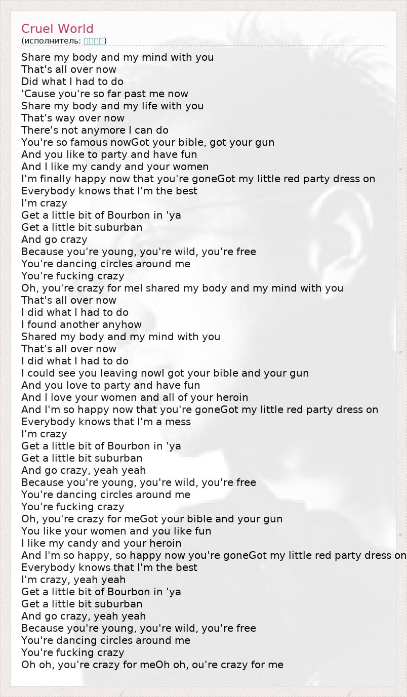 Share my body and my mind with you That's all over now Did what I had to do 'Cause you're so far past me now Share my body and my life with you That's way over now There's not anymore I can do You're so famous nowGot your bible, got your gun And you like to party and have fun And I like my candy and your women I'm finally happy now that you're goneGot my little red party dress on Everybody knows that I'm the best I'm crazy Get a little bit of Bourbon in 'ya Get a little bit suburban And go crazy Because you're young, you're wild, you're free You're dancing circles around me You're fucking crazy Oh, you're crazy for meI shared my body and my mind with you That's all over now I did what I had to do I found another anyhow Shared my body and my mind with you That's all over now I did what I had to do I could see you leaving nowI got your bible and your gun And you love to party and have fun And I love your women and all of your heroin And I'm so happy now that you're goneGot my little red party dress on Everybody knows that I'm a mess I'm crazy Get a little bit of Bourbon in 'ya Get a little bit suburban And go crazy, yeah yeah Because you're young, you're wild, you're free You're dancing circles around me You're fucking crazy Oh, you're crazy for meGot your bible and your gun You like your women and you like fun I like my candy and your heroin And I'm so happy, so happy now you're goneGot my little red party dress on Everybody knows that I'm the best I'm crazy, yeah yeah Get a little bit of Bourbon in 'ya Get a little bit suburban And go crazy, yeah yeah Because you're young, you're wild, you're free You're dancing circles around me You're fucking crazy Oh oh, you're crazy for meOh oh, ou're crazy for me