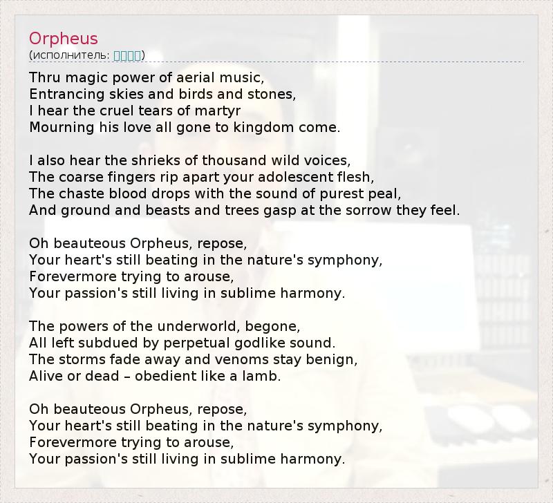 Сквозь волшебную власть нереальной музыки, Чарующие небеса, и птиц, и камни, Я слышу горючие слезы страдальца, Оплакивающего свою любовь, всю ушедшую в загробный мир. Также я слышу вопли тысячи диких голосов, Грубые пальцы разрывают твою юную плоть, Невинная кровь капает со звуком самого мелодичного перезвона, И земля, и звери, и деревья задыхаются в печали, которою они чувствуют. О прекрасный Орфей, поверь, Твое сердце все еще бьется в симфонии природы, Веками пытаясь пробудиться, Предмет твоей страсти все еще живет в великой гармонии. Силы преисподней, прочь, Все ушедшее покорилось бесконечному богоподобному звучанию. Бури уходят, а злые сущности становятся добрыми, Живые или мертвые - послушны, как ягнята. О прекрасный Орфей, поверь, Твое сердце все еще бьется в симфонии природы, Веками пытаясь пробудиться, Предмет твоей страсти все еще живет в великой гармонии.