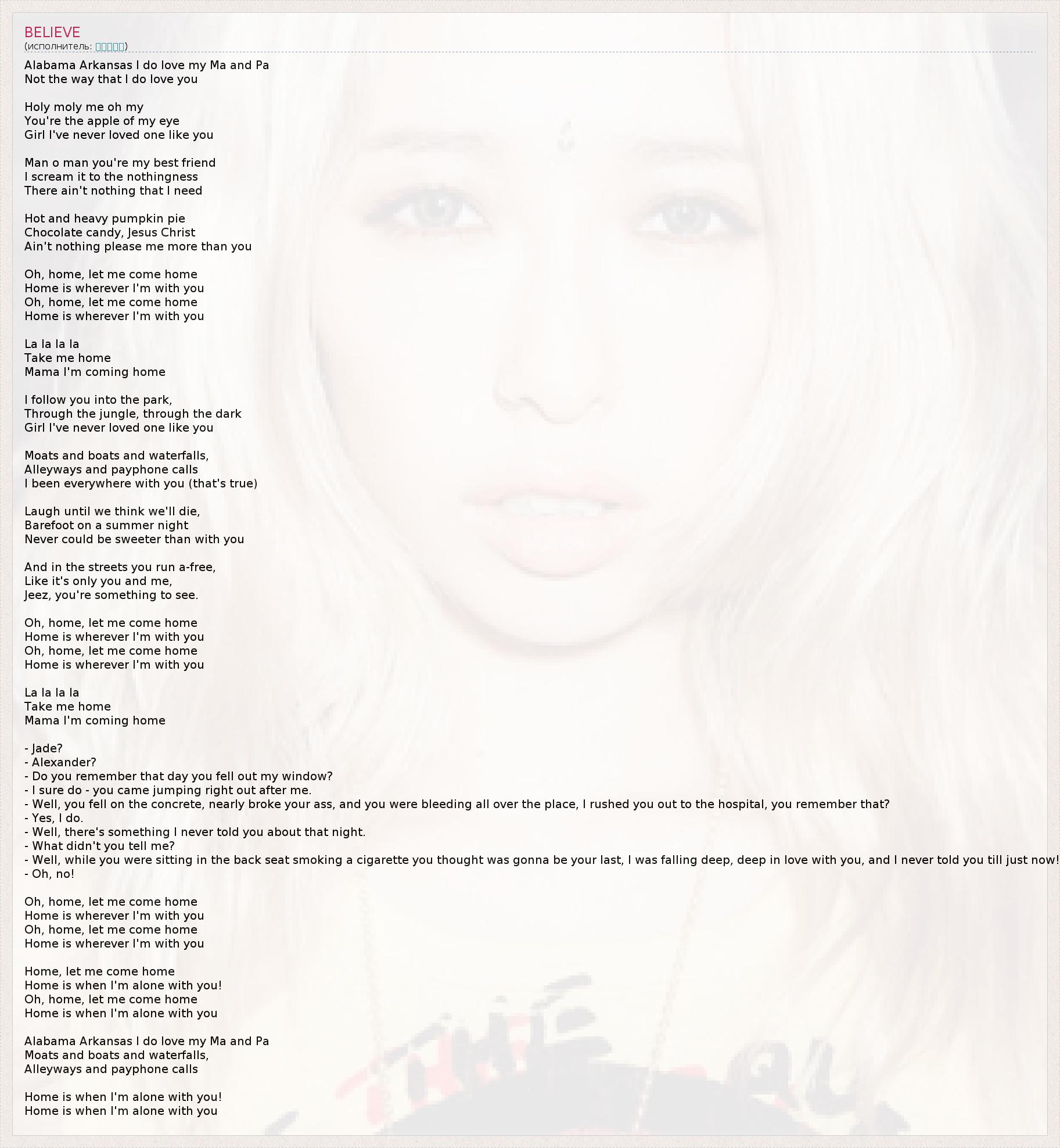 Алабама, Арканзас, я люблю маму и папу, Но не так, как я люблю тебя. О, Боже, Ты зеница моего ока, Девочка, я никого не любил так, как люблю тебя. О, Господи, ты мой лучший друг. Я кричу это в пустоту, Ничего другого мне не нужно. Горячий и тяжелый тыквенный пирог, Шоколадные конфеты, Иисус Христос, Ничто не доставляет мне большего удовольствия, чем ты. Ооо, домой, отвези меня домой. Дом там, где я с тобой. Ооо, домой, отвези меня домой. Дом там, где я с тобой. Ла-ла-ла-ла Отвези меня домой. Мама, я возвращаюсь домой! Я пошёл за тобой в парк, Сквозь дебри, сквозь тьму. Девочка, я никогда не любил никого так, как люблю тебя. Рвы и лодки, водопады, Переулки и звонки из таксофона. Я везде побывал с тобой (это правда) Смех до упаду, Прогулки босиком летней ночью - Лучше чем с тобой и быть не могло. Бег по пустынным улицам, 1 Будто есть только ты и я. Боже, ты просто нечто! Ооо, домой, отвези меня домой. Дом там, где я с тобой. Ооо, домой, отвези меня домой. Дом там, где я с тобой. Ла-ла-ла-ла Отвези меня домой. Мама, я возвращаюсь домой! - Джейд? - Александр? - Ты помнишь день, когда ты выпала из моего окна? - Конечно, ты выпрыгнул за мной следом. - Ну, ты упала на бетон, чуть не сломала зад**цу, была вся в крови, и я отвез тебя в больницу, помнишь это? - Да, помню. - Ну, есть кое-что, что я тебе никогда не рассказывал про ту ночь. - Что ты не сказал мне? - Ну, пока ты сидела на заднем сидении и курила сигарету, пообещав себе, что она последняя, я по уши влюбился в тебя и до этого момента не говорил тебе об этом! - О, нет! Домой, отвези меня домой. Дом всюду, где я с тобой. Ооо, домой, отвези меня домой. Дом всюду, где я с тобой. Ооо, домой, отвези меня домой. Дом всюду, где я с тобой. Ооо, домой, отвези меня домой. Дом всюду, где я с тобой. Алабама, Арканзас, я люблю маму и папу. Рвы и лодки, водопады... Переулки и звонки из таксофона... Дом там, где я наедине с тобой. Дом там, где я наедине с тобой. 1 - дословно: свободный бег по улицам