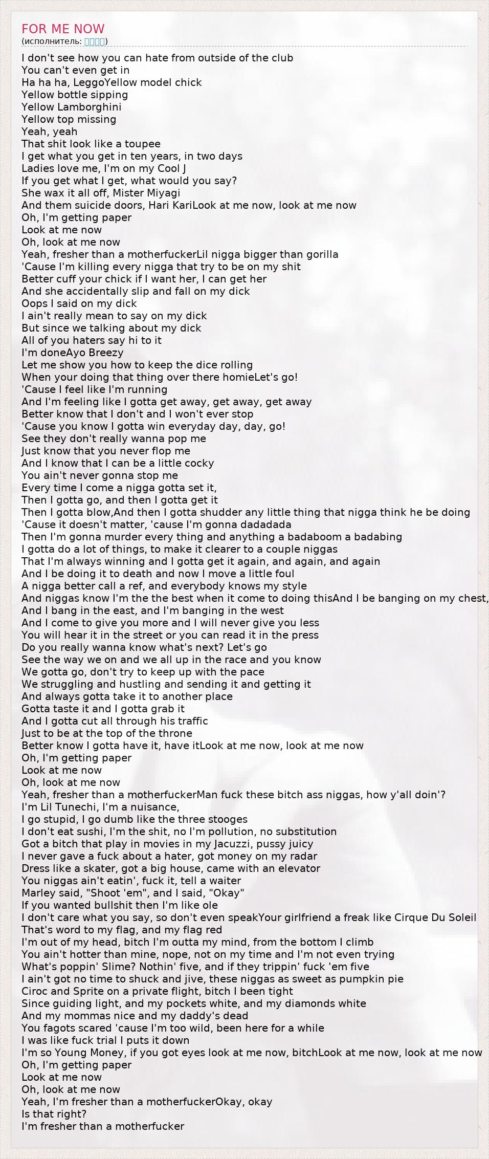 I don't see how you can hate from outside of the club You can't even get in Ha ha ha, LeggoYellow model chick Yellow bottle sipping Yellow Lamborghini Yellow top missing Yeah, yeah That shit look like a toupee I get what you get in ten years, in two days Ladies love me, I'm on my Cool J If you get what I get, what would you say? She wax it all off, Mister Miyagi And them suicide doors, Hari KariLook at me now, look at me now Oh, I'm getting paper Look at me now Oh, look at me now Yeah, fresher than a motherfuckerLil nigga bigger than gorilla 'Cause I'm killing every nigga that try to be on my shit Better cuff your chick if I want her, I can get her And she accidentally slip and fall on my dick Oops I said on my dick I ain't really mean to say on my dick But since we talking about my dick All of you haters say hi to it I'm doneAyo Breezy Let me show you how to keep the dice rolling When your doing that thing over there homieLet's go! 'Cause I feel like I'm running And I'm feeling like I gotta get away, get away, get away Better know that I don't and I won't ever stop 'Cause you know I gotta win everyday day, day, go! See they don't really wanna pop me Just know that you never flop me And I know that I can be a little cocky You ain't never gonna stop me Every time I come a nigga gotta set it, Then I gotta go, and then I gotta get it Then I gotta blow,And then I gotta shudder any little thing that nigga think he be doing 'Cause it doesn't matter, 'cause I'm gonna dadadada Then I'm gonna murder every thing and anything a badaboom a badabing I gotta do a lot of things, to make it clearer to a couple niggas That I'm always winning and I gotta get it again, and again, and again And I be doing it to death and now I move a little foul A nigga better call a ref, and everybody knows my style And niggas know I'm the the best when it come to doing thisAnd I be banging on my chest, And I bang in the east, and I'm banging in the west And I come to give you more and I will never give you less You will hear it in the street or you can read it in the press Do you really wanna know what's next? Let's go See the way we on and we all up in the race and you know We gotta go, don't try to keep up with the pace We struggling and hustling and sending it and getting it And always gotta take it to another place Gotta taste it and I gotta grab it And I gotta cut all through his traffic Just to be at the top of the throne Better know I gotta have it, have itLook at me now, look at me now Oh, I'm getting paper Look at me now Oh, look at me now Yeah, fresher than a motherfuckerMan fuck these bitch ass niggas, how y'all doin'? I'm Lil Tunechi, I'm a nuisance, I go stupid, I go dumb like the three stooges I don't eat sushi, I'm the shit, no I'm pollution, no substitution Got a bitch that play in movies in my Jacuzzi, pussy juicy I never gave a fuck about a hater, got money on my radar Dress like a skater, got a big house, came with an elevator You niggas ain't eatin', fuck it, tell a waiter Marley said, "Shoot 'em", and I said, "Okay" If you wanted bullshit then I'm like ole I don't care what you say, so don't even speakYour girlfriend a freak like Cirque Du Soleil That's word to my flag, and my flag red I'm out of my head, bitch I'm outta my mind, from the bottom I climb You ain't hotter than mine, nope, not on my time and I'm not even trying What's poppin' Slime? Nothin' five, and if they trippin' fuck 'em five I ain't got no time to shuck and jive, these niggas as sweet as pumpkin pie Ciroc and Sprite on a private flight, bitch I been tight Since guiding light, and my pockets white, and my diamonds white And my mommas nice and my daddy's dead You fagots scared 'cause I'm too wild, been here for a while I was like fuck trial I puts it down I'm so Young Money, if you got eyes look at me now, bitchLook at me now, look at me now Oh, I'm getting paper Look at me now Oh, look at me now Yeah, I'm fresher than a motherfuckerOkay, okay Is that right? I'm fresher than a motherfucker