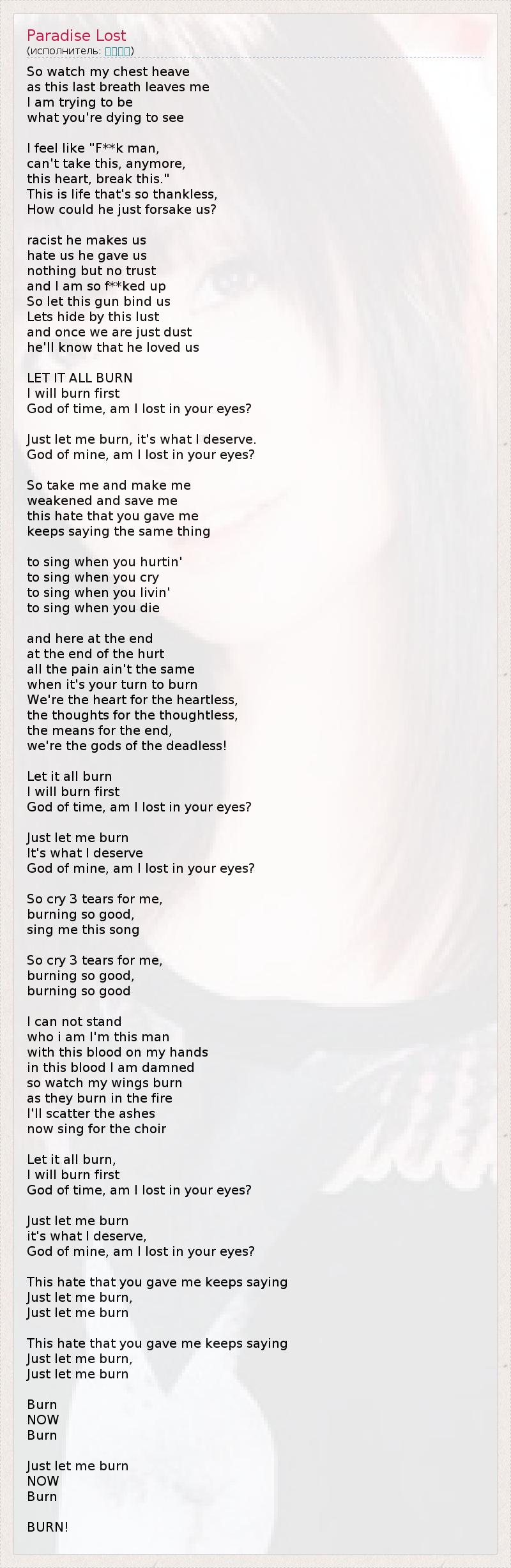 [1-ый куплет:] Смотри, как поднимается моя грудь на последнем выдохе. Я пытаюсь быть тем, что ты страстно желаешь увидеть, И ощущаю следующее: "Чёрт возьми, Я больше не могу это терпеть, Это сердце, разбей его..." Эта жизнь, в которой ничто не предопределено, Как он мог так запросто покинуть нас? Ломает нас, он заставляет нас ненавидеть самих себя, он не дал нам Ничего, кроме неверия, и я в полной зад**це. Так пусть это ружьё свяжет нас узами, пусть нас объединит это желание, А как только мы превратимся в пыль, он поймёт, что любит нас. [Припев:] Пусть всё горит, Я сгорю первым. Боже, я пытался, я потерян в твоих глазах? Просто позволь мне сгореть, Это то, чего я заслуживаю. Боже, я солгал, я потерян в твоих глазах? [2-ой куплет:] Так возьми меня и сделай Слабым, а затем спаси меня. Эта ненависть, которой ты наделил меня, Повторяет одно и то же: Петь, когда тебе больно, петь, когда ты плачешь, Петь, когда ты живёшь, петь, когда ты умираешь. И здесь, на краю, на краю боли, Боль воспринимается совсем иначе, когда настаёт твоя очередь гореть. Мы - сердце для бессердечных, Мысли для бездумных, Ложь для честных, Мы боги безбожников. [Припев:] Пусть всё горит, Я сгорю первым. Боже, я пытался, я потерян в твоих глазах? Просто позволь мне сгореть, Это то, чего я заслуживаю. Боже, я солгал, я потерян в твоих глазах? [3-ий куплет:] Так пролей по мне три слезинки. А когда всё закончится, спой мне эту песню. Так пролей по мне три слезинки, Когда всё закончится, когда всё закончится... Я терпеть не могу того, кем являюсь: я - человек С кровью на руках, и я проклят в этой крови. Так смотри, как горят мои крылья, как они горят в огне. Не развеивай пепел, не нужен церковный хор. [Припев:] Пусть всё горит, Я сгорю первым. Боже, я пытался, я потерян в твоих глазах? Просто позволь мне сгореть, Это то, чего я заслуживаю. Боже, я солгал, я потерян в твоих глазах? Эта ненависть, которой ты наделил меня, повторяет... Просто позволь мне сгореть, позволь сгореть... Эта ненависть, которой ты наделил меня, повторяет... Просто позволь мне сгореть, позволь сгореть... Сгореть... сгореть... Просто позволь мне сгореть... сгореть... сгореть...