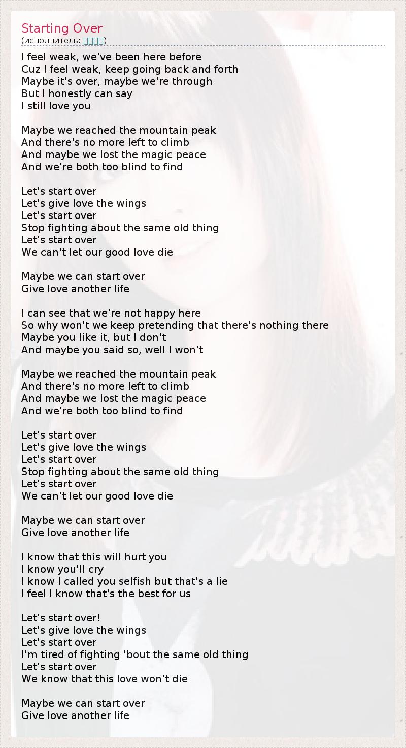 Я чувствую себя слабой, подобное с нами уже было. Я чувствую себя слабой, продолжая ходить взад и вперед, Может, все кончено, может, мы уже расстались, Но, честно говоря, я могу сказать, Что все еще тебя люблю... Может, мы взобрались на самую вершину горы, И больше уже некуда подниматься. А может, потеряли волшебный покой И слишком слепы, чтобы обрести его... Давай начнем все сначала, Давай окрылим нашу любовь! Начнем все сначала, Прекратим ссориться из-за старых разногласий, Начнем все сначала - Мы не можем позволить нашей любви умереть... Возможно, мы начнём все заново, Дадим любви новую жизнь... Я вижу, что так мы не счастливы, Тогда почему бы нам не притворяться и дальше, что всё в порядке? Может, тебе это и нравится, но мне - нет, Может, ты так говорил, только я не стану... Может, мы достигли горной вершины, И больше уже некуда подниматься. А может, потеряли волшебный покой И слишком слепы, чтобы обрести его... Давай начнем все сначала, Давай окрылим нашу любовь! Начнем все сначала, Прекратим ссориться из-за старых разногласий, Начнем все сначала - Мы не можем позволить нашей любви умереть... Возможно, мы начнём все заново, Дадим любви новую жизнь... Я знаю, что это тебя обидит, Я знаю, что ты будешь плакать. Знаю, что называла тебя эгоистичным, но это ложь.. Я чувствую, я знаю, так лучше для нас... Давай начнем все сначала, Давай окрылим нашу любовь! Начнем все сначала, Прекратим ссориться по старым разногласиям, Начнем все сначала - Мы не можем позволить нашей любви умереть... Возможно, мы начнём все заново, Дадим любви новую жизнь...