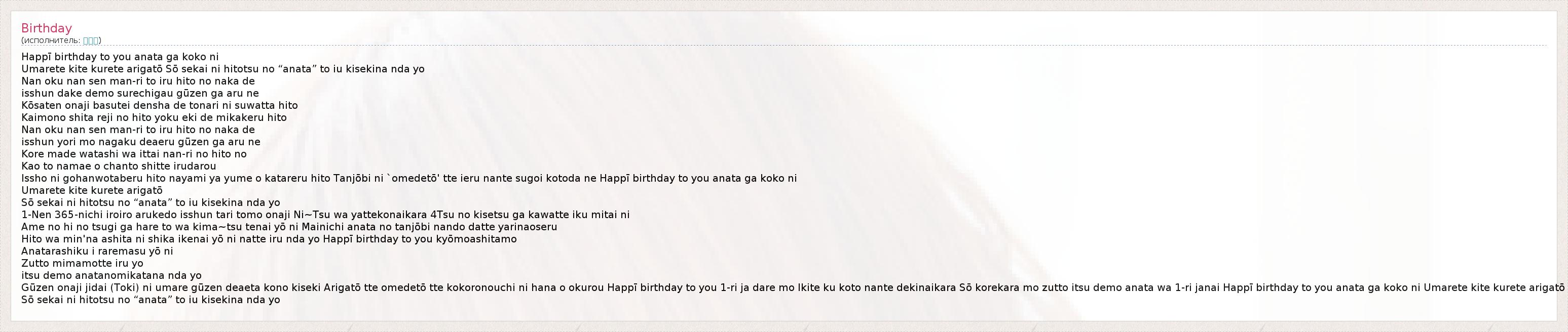 Gūzen onaji дзидай ( Токи ) Ni umare gūzen deaeta Коно Kiseki Arigato TTE omedetō TTE kokoronouchi Ni хана о okurou Happi рождения тебя 1 -ри JA смел мо Ikite ку кото нанте dekinaikara так korekara мо Zutto ИТСУ демо Аната ва 1 -ри janai Happi рождения вам Аната га Коко Ni Umarete кайт kurete Arigato