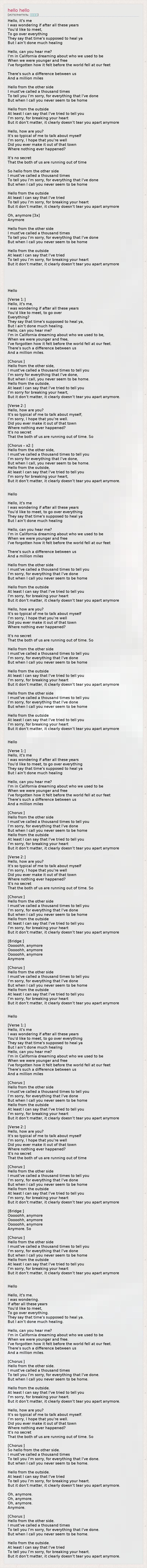 Hello, it's me I was wondering if after all these years You'd like to meet, To go over everything They say that time's supposed to heal ya But I ain't done much healing Hello, can you hear me? I'm in California dreaming about who we used to be When we were younger and free I've forgotten how it felt before the world fell at our feet There's such a difference between us And a million miles Hello from the other side I must've called a thousand times To tell you I'm sorry, for everything that I've done But when I call you never seem to be home Hello from the outside At least I can say that I've tried to tell you I'm sorry, for breaking your heart But it don't matter, it clearly doesn't tear you apart anymore Hello, how are you? It's so typical of me to talk about myself I'm sorry, I hope that you're well Did you ever make it out of that town Where nothing ever happened? It's no secret That the both of us are running out of time So hello from the other side I must've called a thousand times To tell you I'm sorry, for everything that I've done But when I call you never seem to be home Hello from the outside At least I can say that I've tried To tell you I'm sorry, for breaking your heart But it don't matter, it clearly doesn't tear you apart anymore Oh, anymore [3x] Anymore Hello from the other side I must've called a thousand times To tell you I'm sorry, for everything that I've done But when I call you never seem to be home Hello from the outside At least I can say that I've tried To tell you I'm sorry, for breaking your heart But it don't matter, it clearly doesn't tear you apart anymore Hello [Verse 1:] Hello, it's me, I was wondering if after all these years You'd like to meet, to go over Everything? They say that time's supposed to heal ya, But I ain't done much healing. Hello, can you hear me? I'm in California dreaming about who we used to be, When we were younger and free, I've forgotten how it felt before the world fell at our feet. There's such a difference between us And a million miles. [Chorus:] Hello from the other side, I must've called a thousand times to tell you I'm sorry for everything that I've done, But when I call, you never seem to be home. Hello from the outside, At least I can say that I've tried to tell you I'm sorry for breaking your heart, But it don't matter, it clearly doesn't tear you apart anymore. [Verse 2:] Hello, how are you? It's so typical of me to talk about myself, I'm sorry, I hope that you're well. Did you ever make it out of that town Where nothing ever happened? It's no secret That the both of us are running out of time. So [Chorus – x2:] Hello from the other side, I must've called a thousand times to tell you I'm sorry for everything that I've done, But when I call, you never seem to be home. Hello from the outside, At least I can say that I've tried to tell you I'm sorry for breaking your heart, But it don't matter, it clearly doesn't tear you apart anymore. Hello Hello, it's me I was wondering if after all these years You'd like to meet, to go over everything They say that time's supposed to heal ya But I ain't done much healing Hello, can you hear me? I'm in California dreaming about who we used to be When we were younger and free I've forgotten how it felt before the world fell at our feet There's such a difference between us And a million miles Hello from the other side I must've called a thousand times to tell you I'm sorry, for everything that I've done But when I call you never seem to be home Hello from the outside At least I can say that I've tried to tell you I'm sorry, for breaking your heart But it don't matter, it clearly doesn't tear you apart anymore Hello, how are you? It's so typical of me to talk about myself I'm sorry, I hope that you're well Did you ever make it out of that town Where nothing ever happened? It's no secret That the both of us are running out of time. So Hello from the other side I must've called a thousand times to tell you I'm sorry, for everything that I've done But when I call you never seem to be home Hello from the outside At least I can say that I've tried to tell you I'm sorry, for breaking your heart But it don't matter, it clearly doesn't tear you apart anymore Hello from the other side I must've called a thousand times to tell you I'm sorry, for everything that I've done But when I call you never seem to be home Hello from the outside At least I can say that I've tried to tell you I'm sorry, for breaking your heart But it don't matter, it clearly doesn't tear you apart anymore Hello [Verse 1:] Hello, it's me I was wondering if after all these years You'd like to meet, to go over everything They say that time's supposed to heal ya But I ain't done much healing Hello, can you hear me? I'm in California dreaming about who we used to be When we were younger and free I've forgotten how it felt before the world fell at our feet There's such a difference between us And a million miles [Chorus:] Hello from the other side I must've called a thousand times to tell you I'm sorry, for everything that I've done But when I call you never seem to be home Hello from the outside At least I can say that I've tried to tell you I'm sorry, for breaking your heart But it don't matter, it clearly doesn't tear you apart anymore [Verse 2:] Hello, how are you? It's so typical of me to talk about myself I'm sorry, I hope that you're well Did you ever make it out of that town Where nothing ever happened? It's no secret That the both of us are running out of time. So [Chorus:] Hello from the other side I must've called a thousand times to tell you I'm sorry, for everything that I've done But when I call you never seem to be home Hello from the outside At least I can say that I've tried to tell you I'm sorry, for breaking your heart But it don't matter, it clearly doesn't tear you apart anymore [Bridge:] Ooooohh, anymore Ooooohh, anymore Ooooohh, anymore Anymore [Chorus:] Hello from the other side I must've called a thousand time