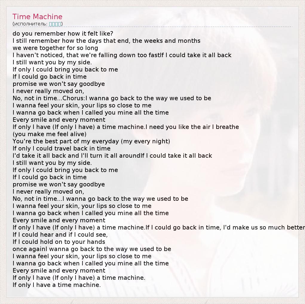 do you remember how it felt like? I still remember how the days that end, the weeks and months we were together for so long I haven't noticed, that we're falling down too fastIf I could take it all back I still want you by my side. If only I could bring you back to me If I could go back in time promise we won't say goodbye I never really moved on, No, not in time...Chorus:I wanna go back to the way we used to be I wanna feel your skin, your lips so close to me I wanna go back when I called you mine all the time Every smile and every moment If only I have (If only I have) a time machine.I need you like the air I breathe (you make me feel alive) You're the best part of my everyday (my every night) If only I could travel back in time I'd take it all back and I'll turn it all aroundIf I could take it all back I still want you by my side. If only I could bring you back to me If I could go back in time promise we won't say goodbye I never really moved on, No, not in time...I wanna go back to the way we used to be I wanna feel your skin, your lips so close to me I wanna go back when I called you mine all the time Every smile and every moment If only I have (If only I have) a time machine.If I could go back in time, I'd make us so much better If I could hear and if I could see, If I could hold on to your hands once againI wanna go back to the way we used to be I wanna feel your skin, your lips so close to me I wanna go back when I called you mine all the time Every smile and every moment If only I have (If only I have) a time machine. If only I have a time machine.