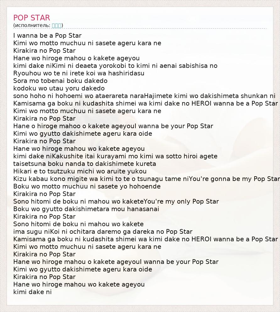 I wanna be a Pop Star Kimi wo motto muchuu ni sasete ageru kara ne Kirakira no Pop Star Hane wo hiroge mahou o kakete ageyou kimi dake niKimi ni deaeta yorokobi to kimi ni aenai sabishisa no Ryouhou wo te ni irete koi wa hashiridasu Sora mo tobenai boku dakedo kodoku wo utau yoru dakedo sono hoho ni hohoemi wo ataerareta naraHajimete kimi wo dakishimeta shunkan ni Kamisama ga boku ni kudashita shimei wa kimi dake no HEROI wanna be a Pop Star Kimi wo motto muchuu ni sasete ageru kara ne Kirakira no Pop Star Hane o hiroge mahoo o kakete ageyouI wanna be your Pop Star Kimi wo gyutto dakishimete ageru kara oide Kirakira no Pop Star Hane wo hiroge mahou wo kakete ageyou kimi dake niKakushite itai kurayami mo kimi wa sotto hiroi agete taisetsuna boku nanda to dakishimete kureta Hikari e to tsutzuku michi wo aruite yukou Kizu kabau kono migite wa kimi to te o tsunagu tame niYou're gonna be my Pop Star Boku wo motto muchuu ni sasete yo hohoende Kirakira no Pop Star Sono hitomi de boku ni mahou wo kaketeYou're my only Pop Star Boku wo gyutto dakishimetara mou hanasanai Kirakira no Pop Star Sono hitomi de boku ni mahou wo kakete ima sugu niKoi ni ochitara daremo ga dareka no Pop Star Kamisama ga boku ni kudashita shimei wa kimi dake no HEROI wanna be a Pop Star Kimi wo motto muchuu ni sasete ageru kara ne Kirakira no Pop Star Hane wo hiroge mahou o kakete ageyouI wanna be your Pop Star Kimi wo gyutto dakishimete ageru kara oide Kirakira no Pop Star Hane wo hiroge mahou wo kakete ageyou kimi dake ni