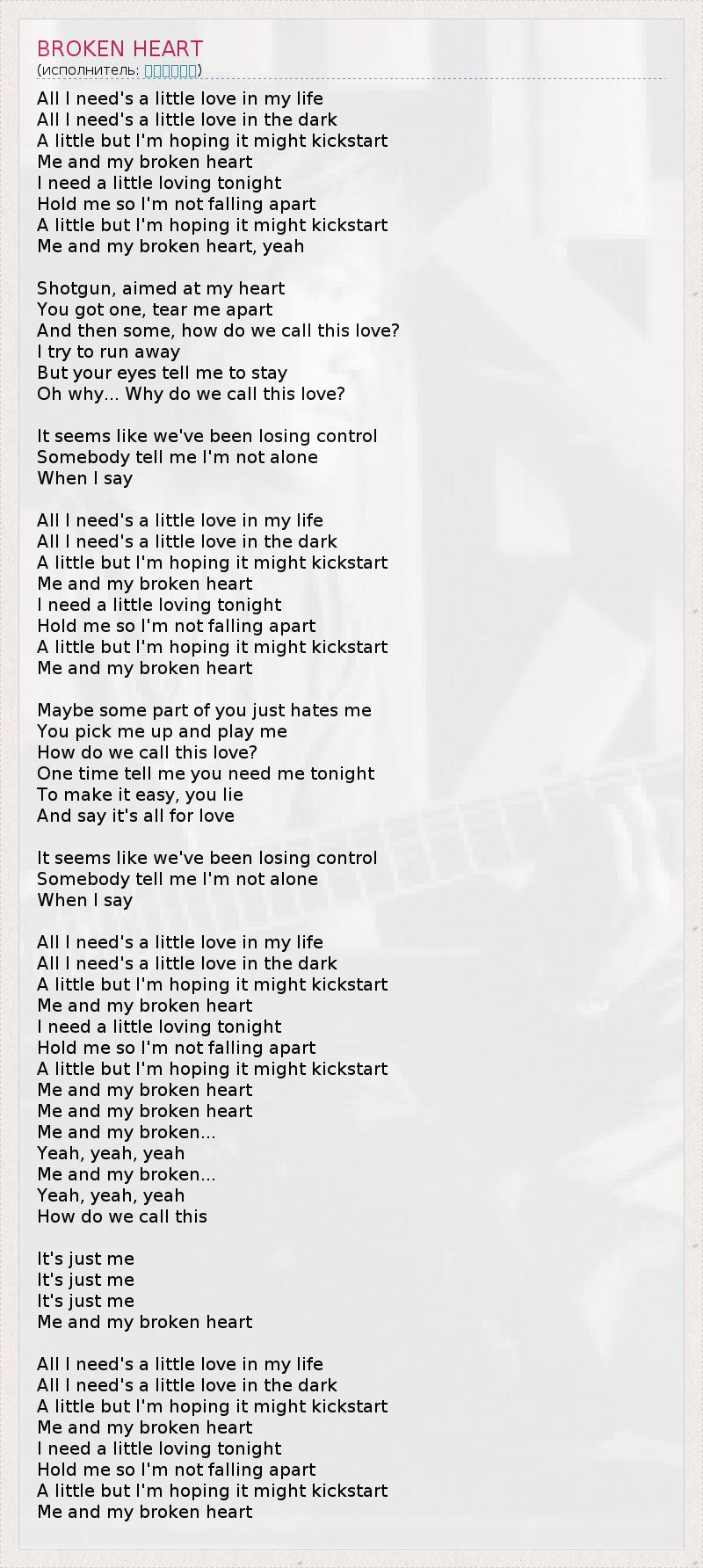 All I need's a little love in my life All I need's a little love in the dark A little but I'm hoping it might kickstart Me and my broken heart I need a little loving tonight Hold me so I'm not falling apart A little but I'm hoping it might kickstart Me and my broken heart, yeah Shotgun, aimed at my heart You got one, tear me apart And then some, how do we call this love? I try to run away But your eyes tell me to stay Oh why... Why do we call this love? It seems like we've been losing control Somebody tell me I'm not alone When I say All I need's a little love in my life All I need's a little love in the dark A little but I'm hoping it might kickstart Me and my broken heart I need a little loving tonight Hold me so I'm not falling apart A little but I'm hoping it might kickstart Me and my broken heart Maybe some part of you just hates me You pick me up and play me How do we call this love? One time tell me you need me tonight To make it easy, you lie And say it's all for love It seems like we've been losing control Somebody tell me I'm not alone When I say All I need's a little love in my life All I need's a little love in the dark A little but I'm hoping it might kickstart Me and my broken heart I need a little loving tonight Hold me so I'm not falling apart A little but I'm hoping it might kickstart Me and my broken heart Me and my broken heart Me and my broken... Yeah, yeah, yeah Me and my broken... Yeah, yeah, yeah How do we call this It's just me It's just me It's just me Me and my broken heart All I need's a little love in my life All I need's a little love in the dark A little but I'm hoping it might kickstart Me and my broken heart I need a little loving tonight Hold me so I'm not falling apart A little but I'm hoping it might kickstart Me and my broken heart
