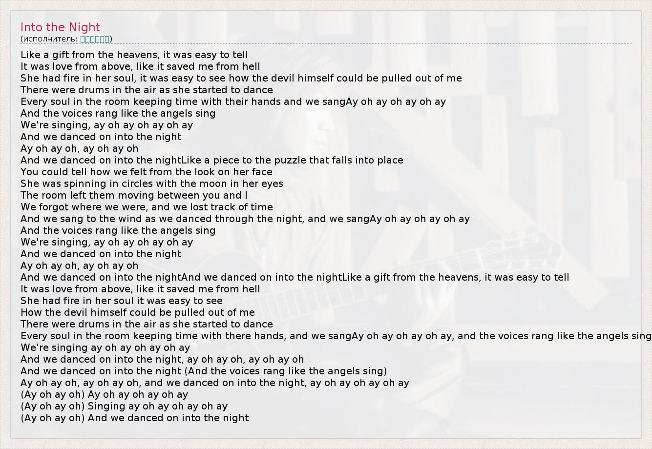And we danced on into the night, ay oh ay oh, ay oh ay oh