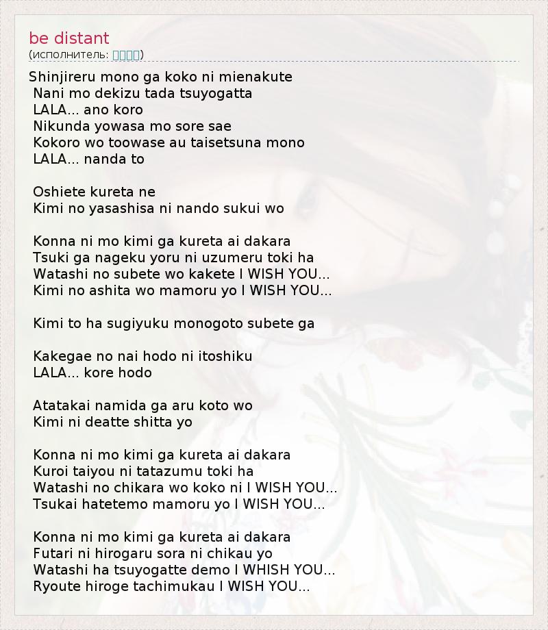 Shinjireru mono ga koko ni mienakute Nani mo dekizu tada tsuyogatta LALA... ano koro Nikunda yowasa mo sore sae Kokoro wo toowase au taisetsuna mono LALA... nanda to Oshiete kureta ne Kimi no yasashisa ni nando sukui wo Konna ni mo kimi ga kureta ai dakara Tsuki ga nageku yoru ni uzumeru toki ha Watashi no subete wo kakete I WISH YOU... Kimi no ashita wo mamoru yo I WISH YOU... Kimi to ha sugiyuku monogoto subete ga Kakegae no nai hodo ni itoshiku LALA... kore hodo Atatakai namida ga aru koto wo Kimi ni deatte shitta yo Konna ni mo kimi ga kureta ai dakara Kuroi taiyou ni tatazumu toki ha Watashi no chikara wo koko ni I WISH YOU... Tsukai hatetemo mamoru yo I WISH YOU... Konna ni mo kimi ga kureta ai dakara Futari ni hirogaru sora ni chikau yo Watashi ha tsuyogatte demo I WHISH YOU... Ryoute hiroge tachimukau I WISH YOU...
