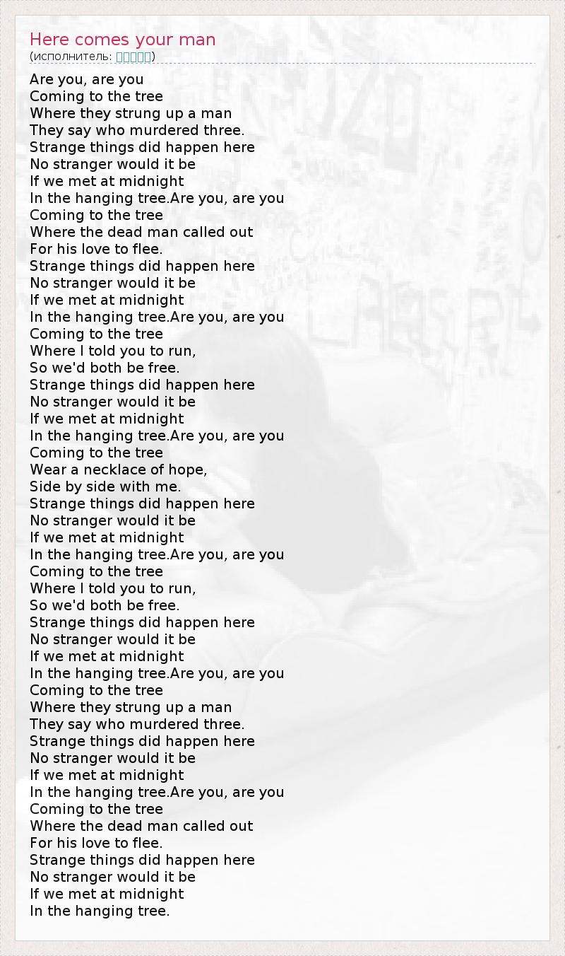 Are you, are you Coming to the tree Where they strung up a man They say who murdered three. Strange things did happen here No stranger would it be If we met at midnight In the hanging tree.Are you, are you Coming to the tree Where the dead man called out For his love to flee. Strange things did happen here No stranger would it be If we met at midnight In the hanging tree.Are you, are you Coming to the tree Where I told you to run, So we'd both be free. Strange things did happen here No stranger would it be If we met at midnight In the hanging tree.Are you, are you Coming to the tree Wear a necklace of hope, Side by side with me. Strange things did happen here No stranger would it be If we met at midnight In the hanging tree.Are you, are you Coming to the tree Where I told you to run, So we'd both be free. Strange things did happen here No stranger would it be If we met at midnight In the hanging tree.Are you, are you Coming to the tree Where they strung up a man They say who murdered three. Strange things did happen here No stranger would it be If we met at midnight In the hanging tree.Are you, are you Coming to the tree Where the dead man called out For his love to flee. Strange things did happen here No stranger would it be If we met at midnight In the hanging tree.