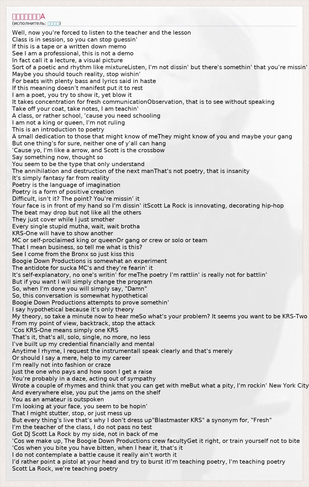 Well, now you're forced to listen to the teacher and the lesson Class is in session, so you can stop guessin' If this is a tape or a written down memo See I am a professional, this is not a demo In fact call it a lecture, a visual picture Sort of a poetic and rhythm like mixtureListen, I'm not dissin' but there's somethin' that you're missin' Maybe you should touch reality, stop wishin' For beats with plenty bass and lyrics said in haste If this meaning doesn't manifest put it to rest I am a poet, you try to show it, yet blow it It takes concentration for fresh communicationObservation, that is to see without speaking Take off your coat, take notes, I am teachin' A class, or rather school, 'cause you need schooling I am not a king or queen, I'm not ruling This is an introduction to poetry A small dedication to those that might know of meThey might know of you and maybe your gang But one thing's for sure, neither one of y'all can hang 'Cause yo, I'm like a arrow, and Scott is the crossbow Say something now, thought so You seem to be the type that only understand The annihilation and destruction of the next manThat's not poetry, that is insanity It's simply fantasy far from reality Poetry is the language of imagination Poetry is a form of positive creation Difficult, isn't it? The point? You're missin' it Your face is in front of my hand so I'm dissin' itScott La Rock is innovating, decorating hip-hop The beat may drop but not like all the others They just cover while I just smother Every single stupid mutha, wait, wait brotha KRS-One will have to show another MC or self-proclaimed king or queenOr gang or crew or solo or team That I mean business, so tell me what is this? See I come from the Bronx so just kiss this Boogie Down Productions is somewhat an experiment The antidote for sucka MC's and they're fearin' it It's self-explanatory, no one's writin' for meThe poetry I'm rattlin' is really not for battlin' But if you want I will simply change the program So, when I'm done you will simply say, "Damn" So, this conversation is somewhat hypothetical Boogie Down Productions attempts to prove somethin' I say hypothetical because it's only theory My theory, so take a minute now to hear meSo what's your problem? It seems you want to be KRS-Two From my point of view, backtrack, stop the attack 'Cos KRS-One means simply one KRS That's it, that's all, solo, single, no more, no less I've built up my credential financially and mental Anytime I rhyme, I request the instrumentalI speak clearly and that's merely Or should I say a mere, help to my career I'm really not into fashion or craze Just the one who pays and how soon I get a raise You're probably in a daze, acting out of sympathy Wrote a couple of rhymes and think that you can get with meBut what a pity, I'm rockin' New York City And everywhere else, you put the jams on the shelf You as an amateur is outspoken I'm looking at your face, you seem to be hopin' That I might stutter, stop, or just mess up But every thing's live that's why I don't dress up"Blastmaster KRS" a synonym for, "Fresh" I'm the teacher of the class, I do not pass no test Got DJ Scott La Rock by my side, not in back of me 'Cos we make up, The Boogie Down Productions crew facultyGet it right, or train yourself not to bite 'Cos when you bite you have bitten, when I hear it, that's it I do not contemplate a battle cause it really ain't worth it I'd rather point a pistol at your head and try to burst itI'm teaching poetry, I'm teaching poetry Scott La Rock, we're teaching poetry