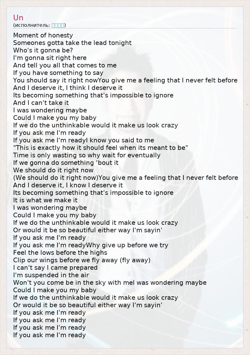 Moment of honesty Someones gotta take the lead tonight Who's it gonna be? I'm gonna sit right here And tell you all that comes to me If you have something to say You should say it right nowYou give me a feeling that I never felt before And I deserve it, I think I deserve it Its becoming something that's impossible to ignore And I can't take it I was wondering maybe Could I make you my baby If we do the unthinkable would it make us look crazy If you ask me I'm ready If you ask me I'm readyI know you said to me "This is exactly how it should feel when its meant to be" Time is only wasting so why wait for eventually If we gonna do something 'bout it We should do it right now (We should do it right now)You give me a feeling that I never felt before And I deserve it, I know I deserve it Its becoming something that's impossible to ignore It is what we make it I was wondering maybe Could I make you my baby If we do the unthinkable would it make us look crazy Or would it be so beautiful either way I'm sayin' If you ask me I'm ready If you ask me I'm readyWhy give up before we try Feel the lows before the highs Clip our wings before we fly away (fly away) I can't say I came prepared I'm suspended in the air Won't you come be in the sky with meI was wondering maybe Could I make you my baby If we do the unthinkable would it make us look crazy Or would it be so beautiful either way I'm sayin' If you ask me I'm ready If you ask me I'm ready If you ask me I'm ready If you ask me I'm ready