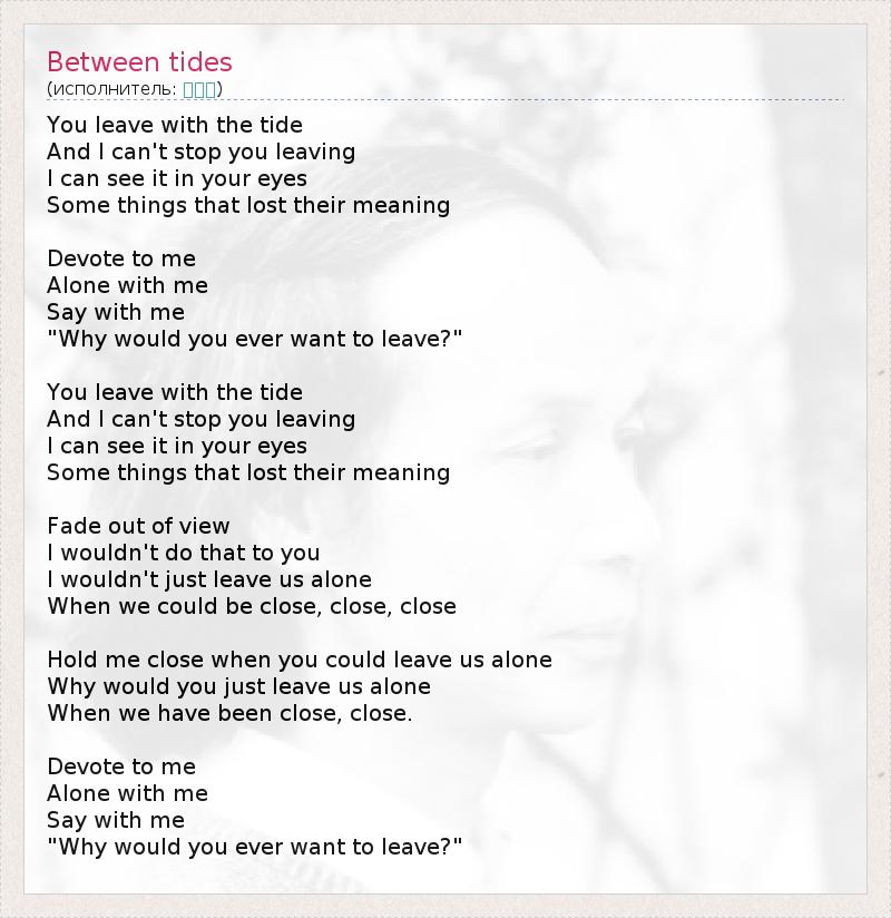 You leave with the tide And I can't stop you leaving I can see it in your eyes Some things that lost their meaning Devote to me Alone with me Say with me "Why would you ever want to leave?" You leave with the tide And I can't stop you leaving I can see it in your eyes Some things that lost their meaning Fade out of view I wouldn't do that to you I wouldn't just leave us alone When we could be close, close, close Hold me close when you could leave us alone Why would you just leave us alone When we have been close, close. Devote to me Alone with me Say with me "Why would you ever want to leave?"