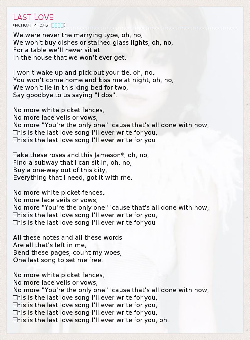 Мы никогда не были одной из тех парочек, которые в итоге женятся, о, нет. Мы не купим набор посуды или ночник с витражным стеклом Для стола, за который мы никогда не сядем, В доме, которого у нас никогда не будет. Я не разбужу тебя и не выберу тебе галстук, о, нет, Ты не будешь возвращаться домой с работы и целовать меня на ночь, о, нет, Мы не будем лежать в этой огромной двуспальной кровати, Так попрощайся же с нашими отношениями, сказав: "Я согласен". Никаких больше милых белых заборчиков у дома, Никаких кружевных вуалей или клятв, Никаких "Ты мой единственный", потому что с этим всем теперь покончено. Это - последняя песня о любви, которую я когда-либо тебе напишу, Это - последняя песня о любви, которую я когда-либо тебе напишу. Забери эти розы и этот виски, 1 о, нет, Найди ближайшую ко мне станцию метро, о, нет, Купи мне билет в один конец из этого города, Всё, что мне нужно, у меня есть с собой. Никаких больше милых белых заборчиков у дома, Никаких кружевных вуалей или клятв, Никаких "Ты мой единственный", потому что с этим всем теперь покончено. Это - последняя песня о любви, которую я когда-либо тебе напишу, Это - последняя песня о любви, которую я когда-либо тебе напишу. Все эти записки и все эти слова - Это то, что осталось у меня. Согни пополам эти страницы, пересчитай все мои беды, Одна последняя песня освободит меня от всего. Никаких больше милых белых заборчиков у дома, Никаких кружевных вуалей или клятв, Никаких "Ты мой единственный", потому что с этим всем теперь покончено. Это - последняя песня о любви, которую я когда-либо тебе напишу, Это - последняя песня о любви, которую я когда-либо тебе напишу, Это - последняя песня о любви, которую я когда-либо тебе напишу, Это - последняя песня о любви, которую я когда-либо тебе напишу, оу. 1 - Jameson - марка ирландского виски
