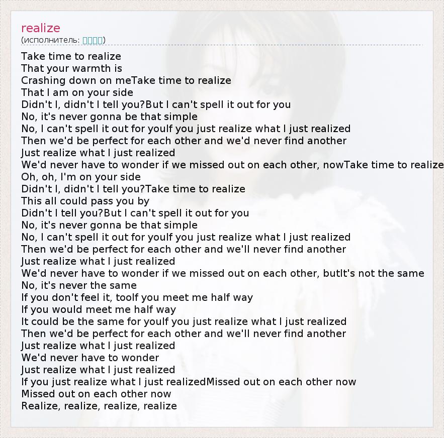 Take time to realize That your warmth is Crashing down on meTake time to realize That I am on your side Didn't I, didn't I tell you?But I can't spell it out for you No, it's never gonna be that simple No, I can't spell it out for youIf you just realize what I just realized Then we'd be perfect for each other and we'd never find another Just realize what I just realized We'd never have to wonder if we missed out on each other, nowTake time to realize Oh, oh, I'm on your side Didn't I, didn't I tell you?Take time to realize This all could pass you by Didn't I tell you?But I can't spell it out for you No, it's never gonna be that simple No, I can't spell it out for youIf you just realize what I just realized Then we'd be perfect for each other and we'll never find another Just realize what I just realized We'd never have to wonder if we missed out on each other, butIt's not the same No, it's never the same If you don't feel it, tooIf you meet me half way If you would meet me half way It could be the same for youIf you just realize what I just realized Then we'd be perfect for each other and we'll never find another Just realize what I just realized We'd never have to wonder Just realize what I just realized If you just realize what I just realizedMissed out on each other now Missed out on each other now Realize, realize, realize, realize