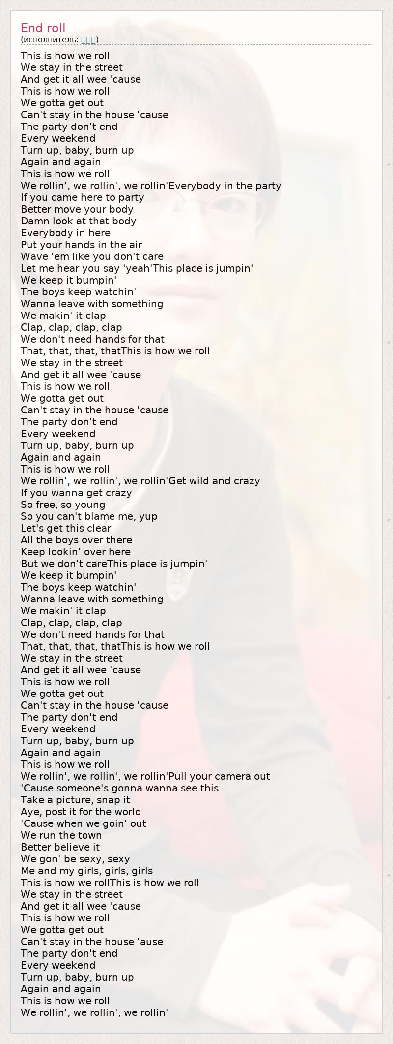 This is how we roll We stay in the street And get it all wee 'cause This is how we roll We gotta get out Can't stay in the house 'cause The party don't end Every weekend Turn up, baby, burn up Again and again This is how we roll We rollin', we rollin', we rollin'Everybody in the party If you came here to party Better move your body Damn look at that body Everybody in here Put your hands in the air Wave 'em like you don't care Let me hear you say 'yeah'This place is jumpin' We keep it bumpin' The boys keep watchin' Wanna leave with something We makin' it clap Clap, clap, clap, clap We don't need hands for that That, that, that, thatThis is how we roll We stay in the street And get it all wee 'cause This is how we roll We gotta get out Can't stay in the house 'cause The party don't end Every weekend Turn up, baby, burn up Again and again This is how we roll We rollin', we rollin', we rollin'Get wild and crazy If you wanna get crazy So free, so young So you can't blame me, yup Let's get this clear All the boys over there Keep lookin' over here But we don't careThis place is jumpin' We keep it bumpin' The boys keep watchin' Wanna leave with something We makin' it clap Clap, clap, clap, clap We don't need hands for that That, that, that, thatThis is how we roll We stay in the street And get it all wee 'cause This is how we roll We gotta get out Can't stay in the house 'cause The party don't end Every weekend Turn up, baby, burn up Again and again This is how we roll We rollin', we rollin', we rollin'Pull your camera out 'Cause someone's gonna wanna see this Take a picture, snap it Aye, post it for the world 'Cause when we goin' out We run the town Better believe it We gon' be sexy, sexy Me and my girls, girls, girls This is how we rollThis is how we roll We stay in the street And get it all wee 'cause This is how we roll We gotta get out Can't stay in the house 'ause The party don't end Every weekend Turn up, baby, burn up Again and again This is how we roll We rollin', we rollin', we rollin'