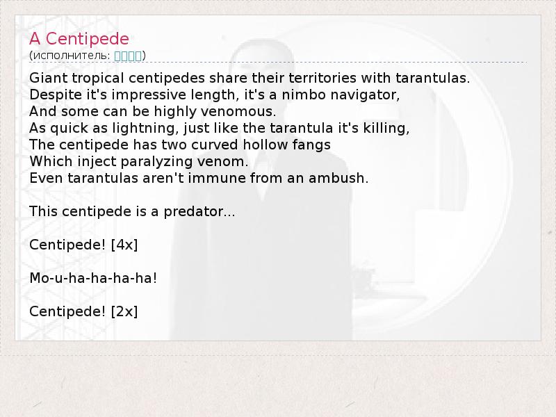 Giant tropical centipedes share their territories with tarantulas. Despite it's impressive length, it's a nimbo navigator, And some can be highly venomous. As quick as lightning, just like the tarantula it's killing, The centipede has two curved hollow fangs Which inject paralyzing venom. Even tarantulas aren't immune from an ambush. This centipede is a predator... Centipede! [4x] Mo-u-ha-ha-ha-ha! Centipede! [2x]