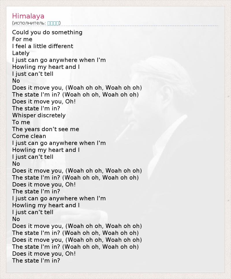 Could you do something For me I feel a little different Lately I just can go anywhere when I'm Howling my heart and I I just can't tell No Does it move you, (Woah oh oh, Woah oh oh) The state I'm in? (Woah oh oh, Woah oh oh) Does it move you, Oh! The state I'm in? Whisper discretely To me The years don't see me Come clean I just can go anywhere when I'm Howling my heart and I I just can't tell No Does it move you, (Woah oh oh, Woah oh oh) The state I'm in? (Woah oh oh, Woah oh oh) Does it move you, Oh! The state I'm in? I just can go anywhere when I'm Howling my heart and I I just can't tell No Does it move you, (Woah oh oh, Woah oh oh) The state I'm in? (Woah oh oh, Woah oh oh) Does it move you, (Woah oh oh, Woah oh oh) The state I'm in? (Woah oh oh, Woah oh oh) Does it move you, Oh! The state I'm in?