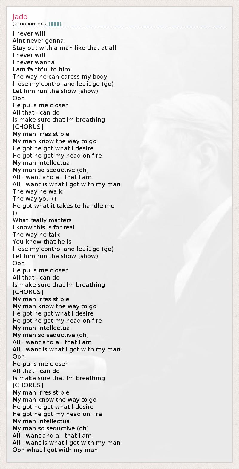 I never will Aint never gonna Stay out with a man like that at all I never will I never wanna I am faithful to him The way he can caress my body I lose my control and let it go (go) Let him run the show (show) Ooh He pulls me closer All that I can do Is make sure that Im breathing [CHORUS] My man irresistible My man know the way to go He got he got what I desire He got he got my head on fire My man intellectual My man so seductive (oh) All I want and all that I am All I want is what I got with my man The way he walk The way you () He got what it takes to handle me () What really matters I know this is for real The way he talk You know that he is I lose my control and let it go (go) Let him run the show (show) Ooh He pulls me closer All that I can do Is make sure that Im breathing [CHORUS] My man irresistible My man know the way to go He got he got what I desire He got he got my head on fire My man intellectual My man so seductive (oh) All I want and all that I am All I want is what I got with my man Ooh He pulls me closer All that I can do Is make sure that Im breathing [CHORUS] My man irresistible My man know the way to go He got he got what I desire He got he got my head on fire My man intellectual My man so seductive (oh) All I want and all that I am All I want is what I got with my man Ooh what I got with my man