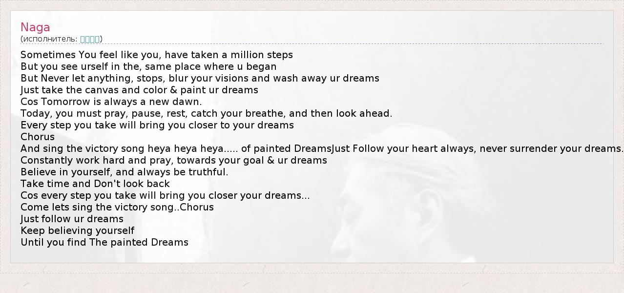 Sometimes You feel like you, have taken a million steps But you see urself in the, same place where u began But Never let anything, stops, blur your visions and wash away ur dreams Just take the canvas and color & paint ur dreams Cos Tomorrow is always a new dawn. Today, you must pray, pause, rest, catch your breathe, and then look ahead. Every step you take will bring you closer to your dreams Chorus And sing the victory song heya heya heya..... of painted DreamsJust Follow your heart always, never surrender your dreams. Constantly work hard and pray, towards your goal & ur dreams Believe in yourself, and always be truthful. Take time and Don't look back Cos every step you take will bring you closer your dreams... Come lets sing the victory song..Chorus Just follow ur dreams Keep believing yourself Until you find The painted Dreams